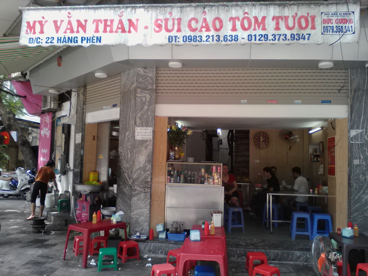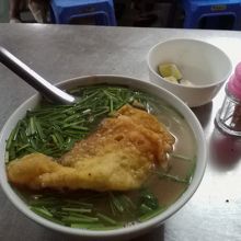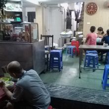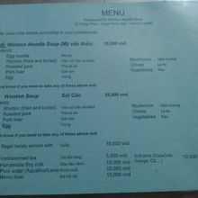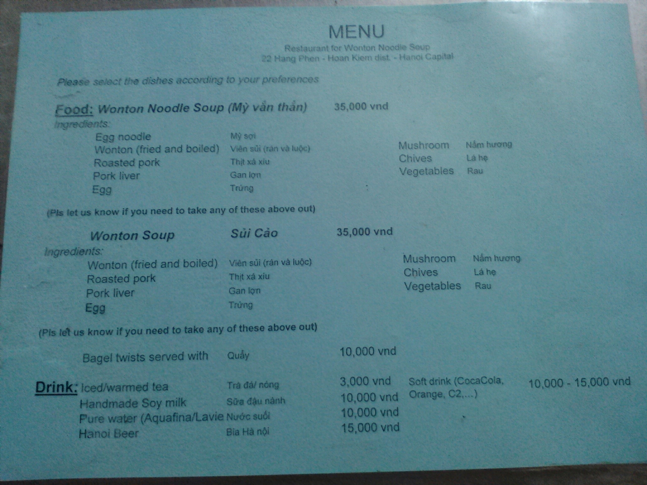 メニューには具の内容が書かれていましたが少し違いました。写真ではニラと特大揚げワンタン(肉ミンチ入り)しか見えませんが中には基本の卵麺、ワンタン3、豚チャーシュー4、小エビ2、しいたけ1、豚レバー1、青菜が入っています。スープは結構味があるのでライムを搾っただけで十分おいしかったです。卓上には胡椒、チリソース、辛子酢があるのでお好みでどうぞ。これで3万5000ドン。お茶は1杯3000ドン取られます。市場周辺の路上のおばちゃんとこのショボい麺でも3万ドンど“言われる”のでそれに比べるとお得かもしれません。