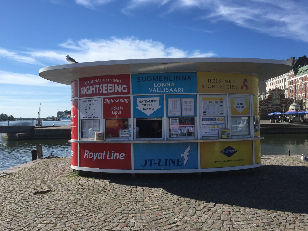 マーケット広場である「Kauppatori カウッパトリ」にある船乗り場。「スオメンリンナ島」行き船や、湾周遊船、対岸のタリン行きの大型フェリーなどがある。「スオメンリンナ島」行きはの船は、いくつか運行会社がある。乗り放題のヘルシンキカードが使えるのは、マーケット広場の真ん中らへんにある市営乗り場から。手前にあるのは、ヘルシンキカードが使えない、有料の船。ただし、湾周遊船は無料で乗れる。