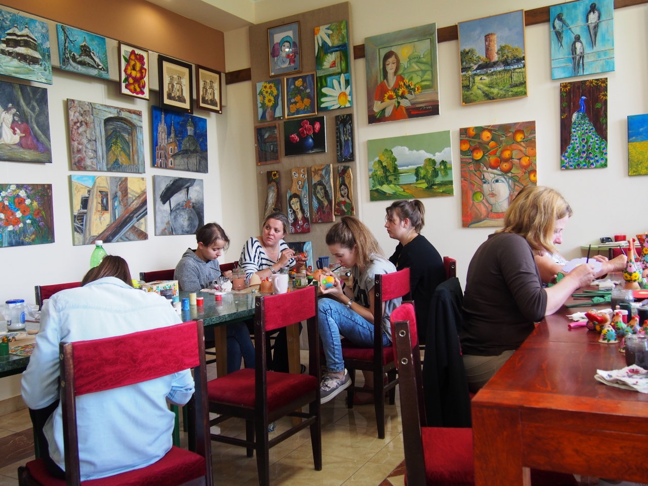 ザビリエの村の花柄ペイントされた家の情報や、観光案内所の中で村の人達が実際に描いている様子を見学したり、花柄ペイント描く特徴など丁寧に紹介しくれます。描いた小物製品をお土産で販売もしてます。案内所ももちろんペイントされてます。