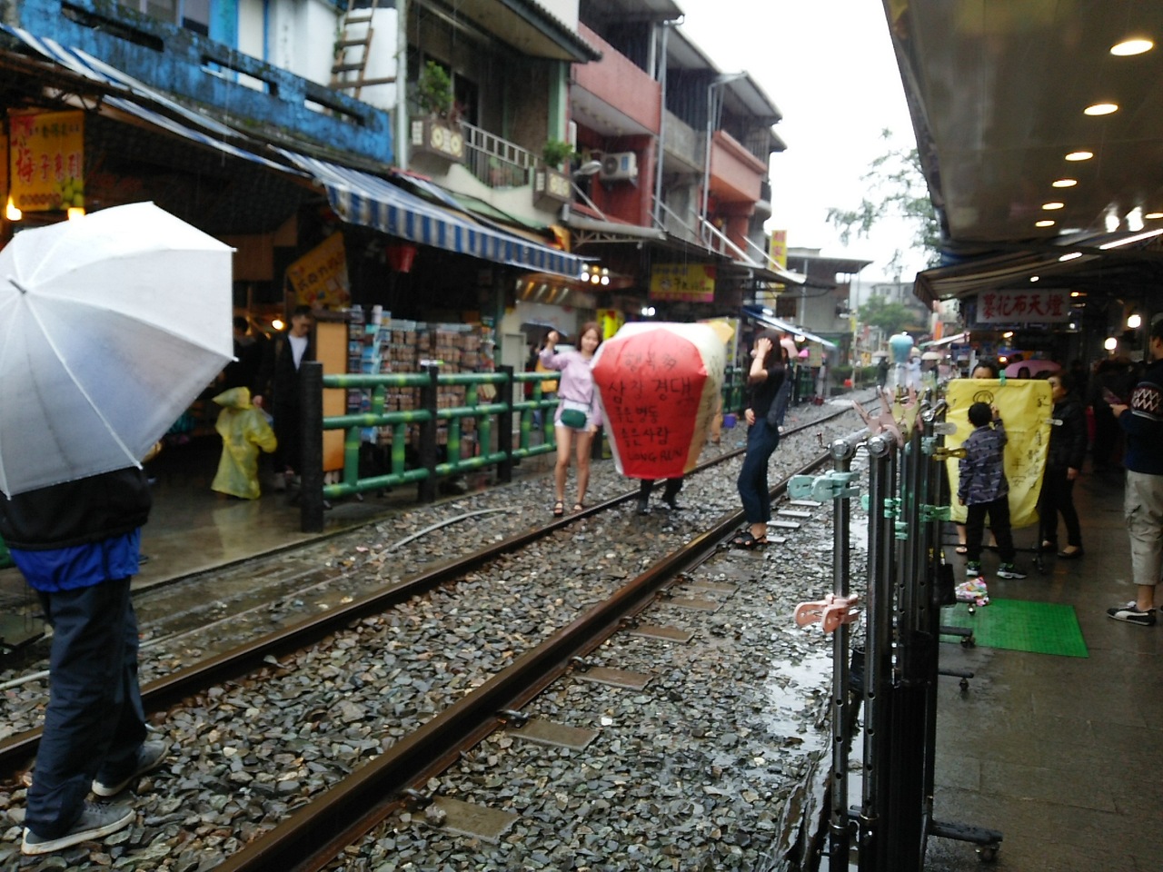 九分の後、平溪線に乗って十分に。目的は天燈上げでした。十分街は歩いても10分くらいのお店が並んだ狭い場所です。雰囲気はお祭り屋台の間を歩いている感じです。