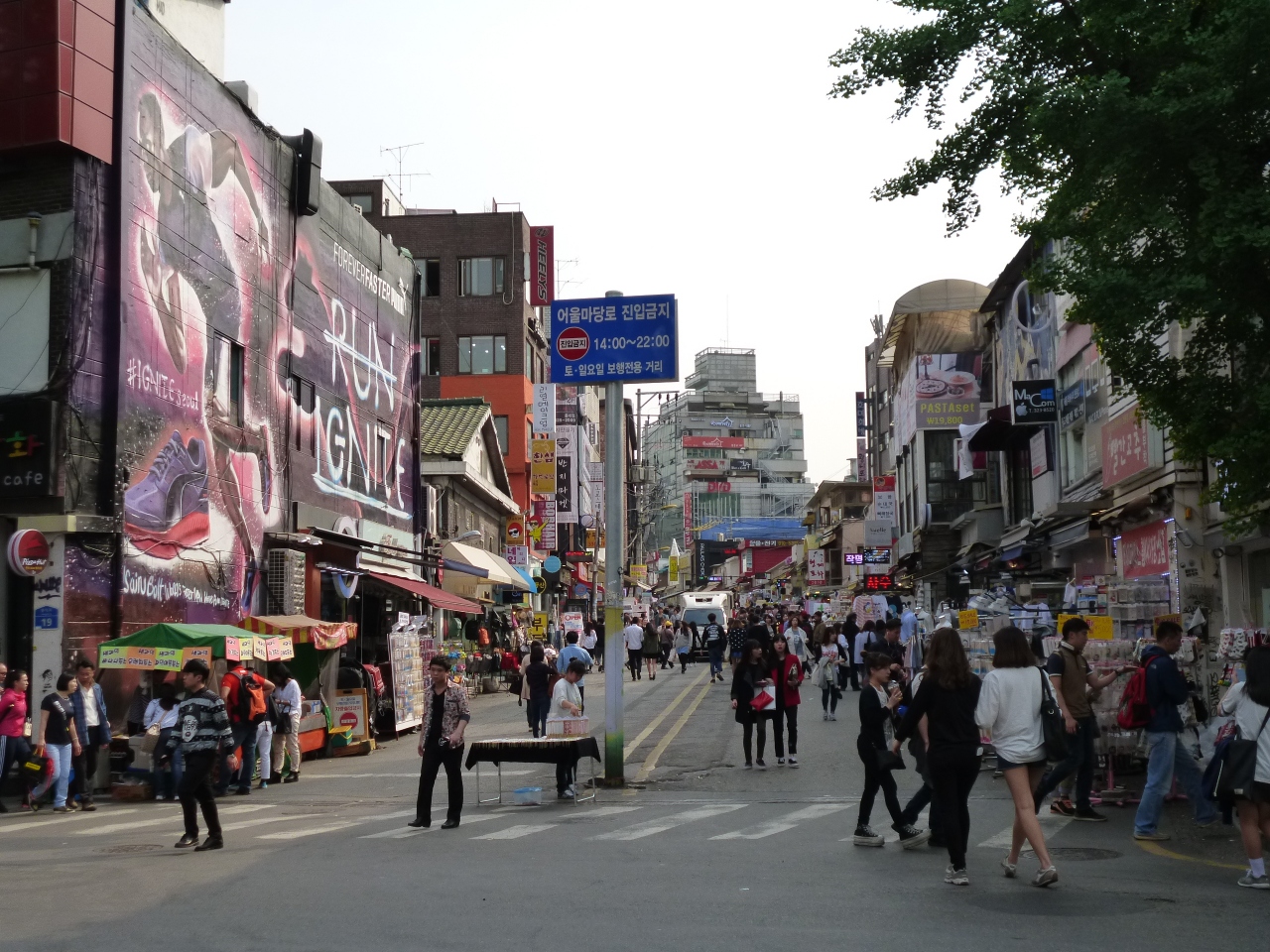 日本からソウル経由で中央アジアを旅するにあたり、行き帰りともソウルで宿泊しましたが、帰路はソウル一泊で、翌朝のフライトが早かったので、仁川空港に近い弘大にホテルをとりました。弘大の街は学生街で、特に目的もなくあるいていて楽しいと感じました。日本では売られていないキャラクターのフェイク商品などもユニークで、見ていて笑える品も多くありました。