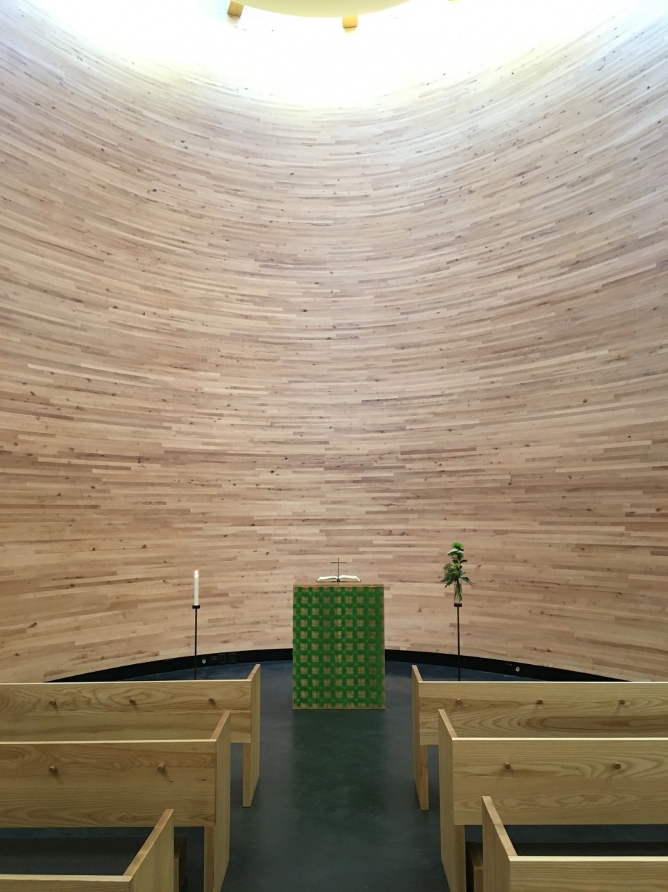 北欧らしいシンプルな木造の礼拝堂で、天井からは光が差し込み、温かみのある空間です。