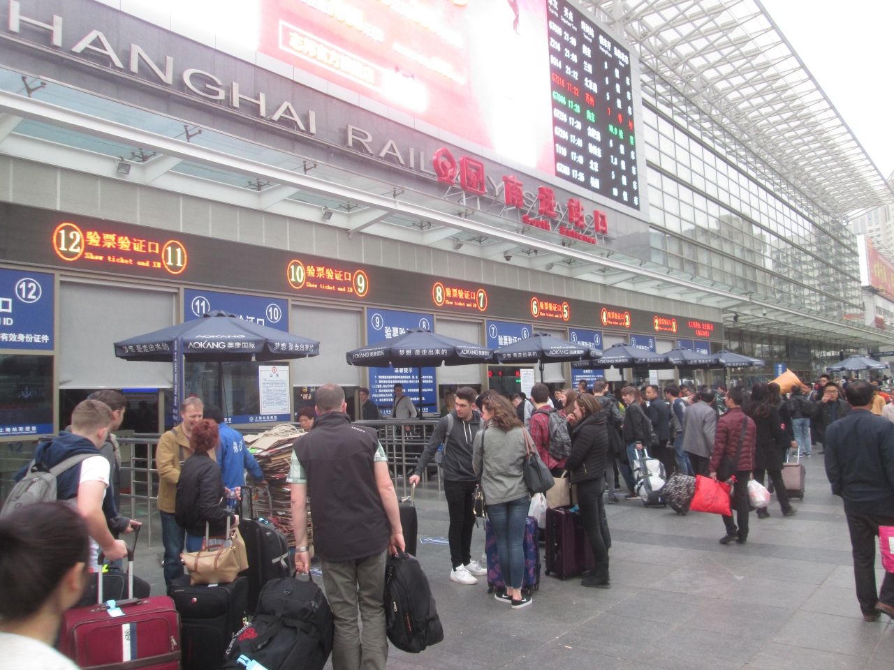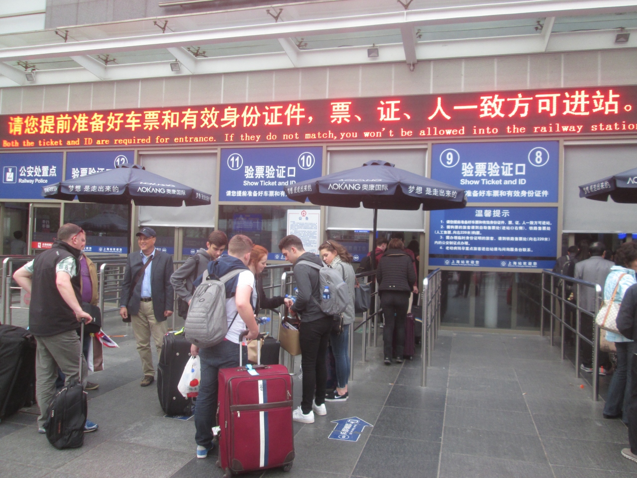 入口には大きい荷物やキャスター付きのカバンを持っている旅行客が並んでいました。中国人だけでなく海外からの旅行客も多く見かけました。入口ではパスポートの検査と荷物検査があり、利用する電車の発車時刻前に余裕を持って到着することが必要です。