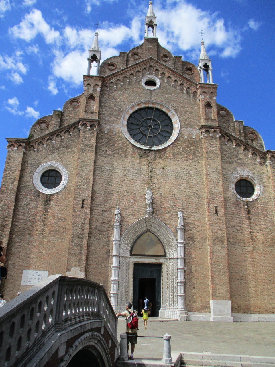 小さな運河を渡ったところにあるゴシック様式の教会、正面の構えはサンティ・ジョヴァンニ・エ・パオロ教会にとてもよく似ています。手祭壇の後ろにあるティツィアーノの代表作「聖母被昇天」他見応えのある絵画が展示されており、ドナテッロの木彫り彩色像「バッティスタ」もあります。中央身廊にある聖歌隊席も大変見事です。