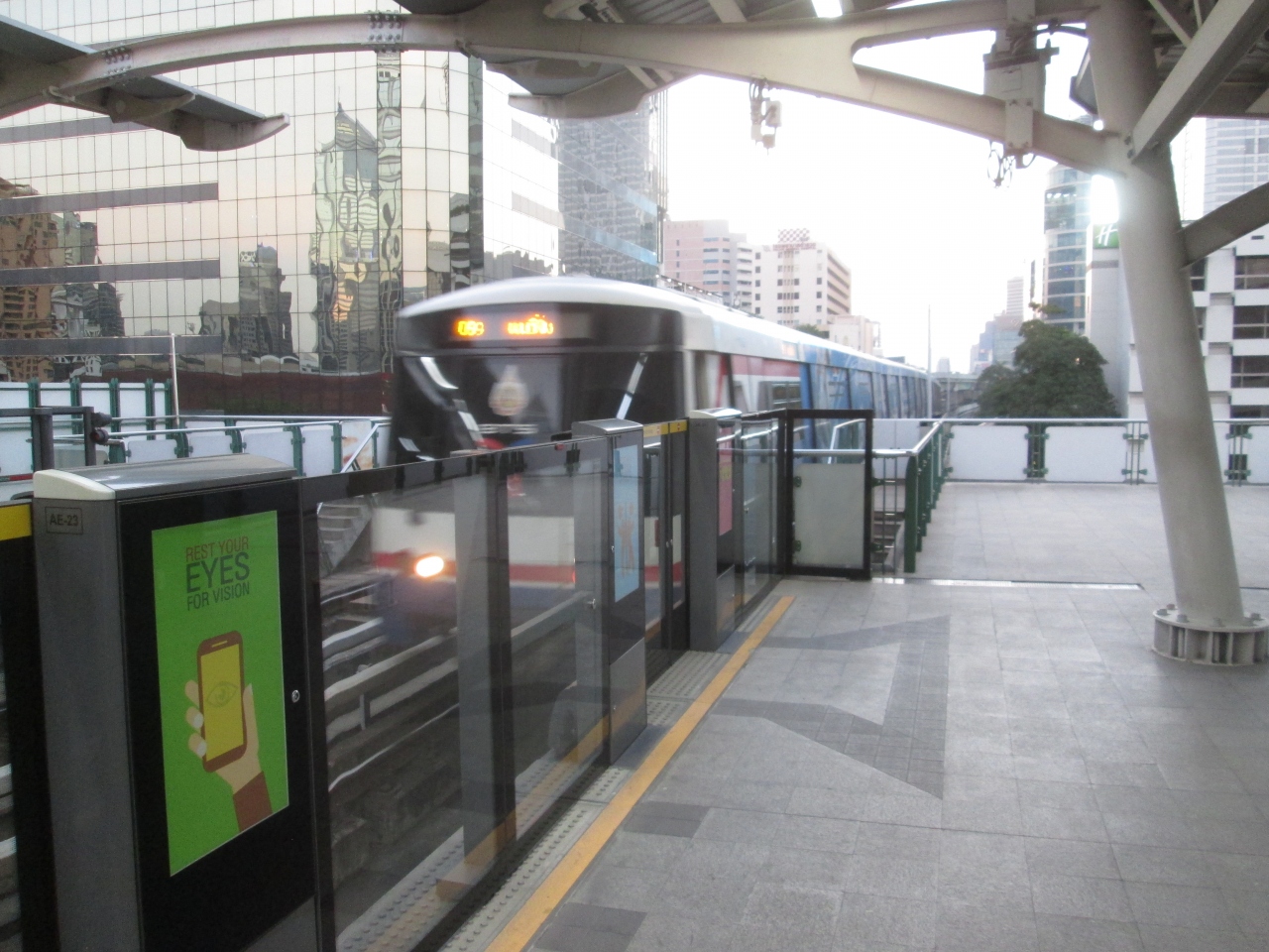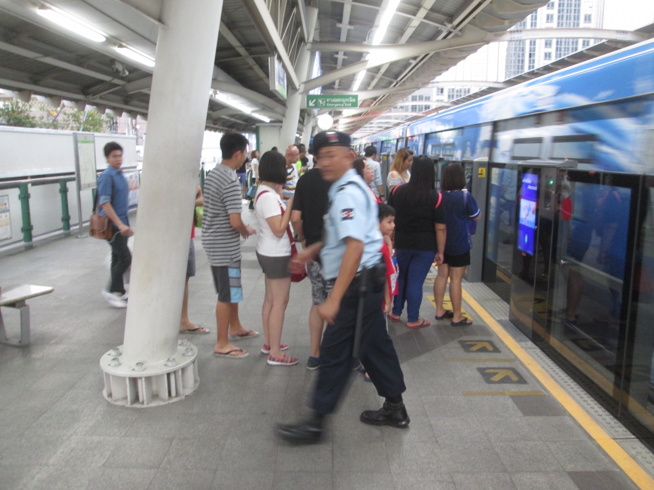 駅ホームにいる警備員さんはいろいろな人がいます。事務的にこなす人、安全柵があるにもかかわらず柵に近づくと笛を鳴らし厳しく指摘する人、チットロム駅で見かけた人は重い荷物を持っていた年配者のサポートをしていました。彼らがBTSの定時運行を支えています。