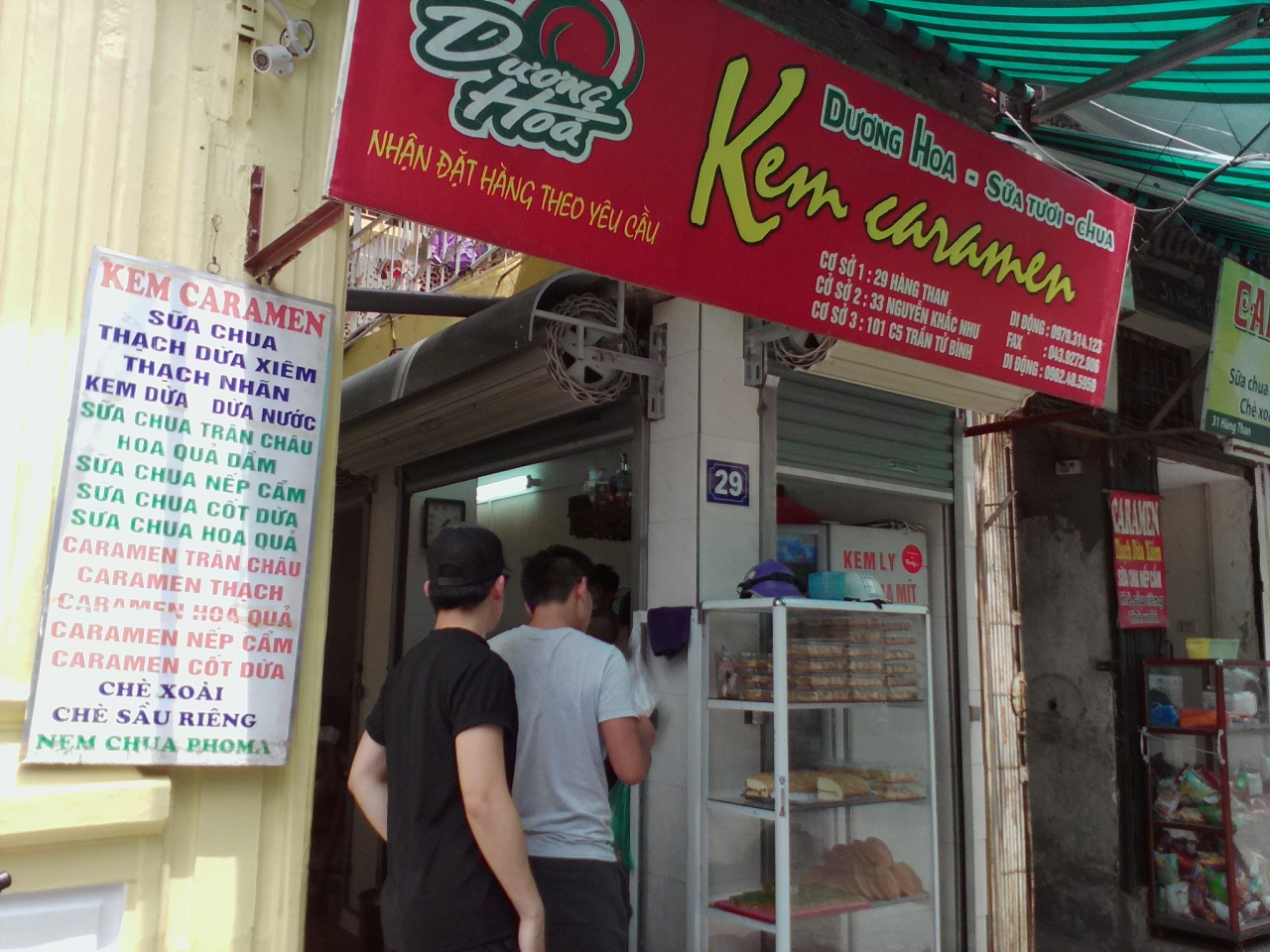 ケム(Kem)はアイスクリーム、カラメン(Caramen)はプリンという意味でこの店の名前は「Duong Hoa(ズン ホア)」になります。隣りや周辺に似たような看板の店がありますので店名か番地で確認すれば確実です。