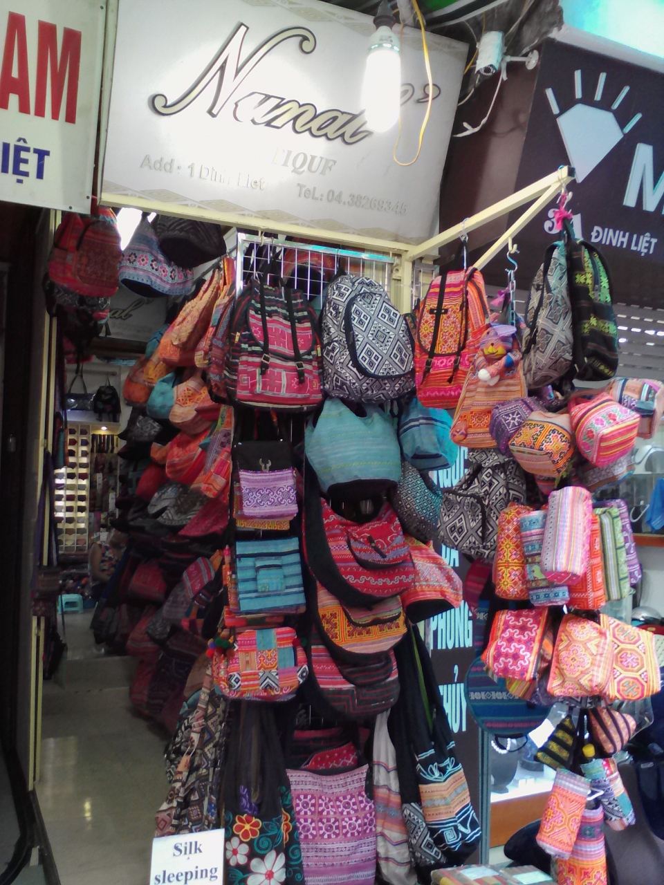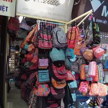 なんとも目立たない土産物屋。間口が異常に狭いです。中を覗くと手招きされました。この店が他と違うのは圧力がなく全ての商品に値段が表示してあるところでしょうか。おすすめばらまき土産としては小銭入れ(2コセットで1$)、サイフ(1$)、筆入れ(1.5$)。どれもベトナム風の刺繍が入っておりこの値段なら大量に買えます。日本ではなかなかお目に書かれないゾウやブタ、ウサギのぬいぐるみ型携帯スタンドなんかもレアだと思います(喜ばれるかどうかはわかりませんが…)。他にはスカーフやバッグ、ネクタイなどもあります。値段交渉の必要なし、楽に気持ちよく買い物できると思います。
