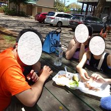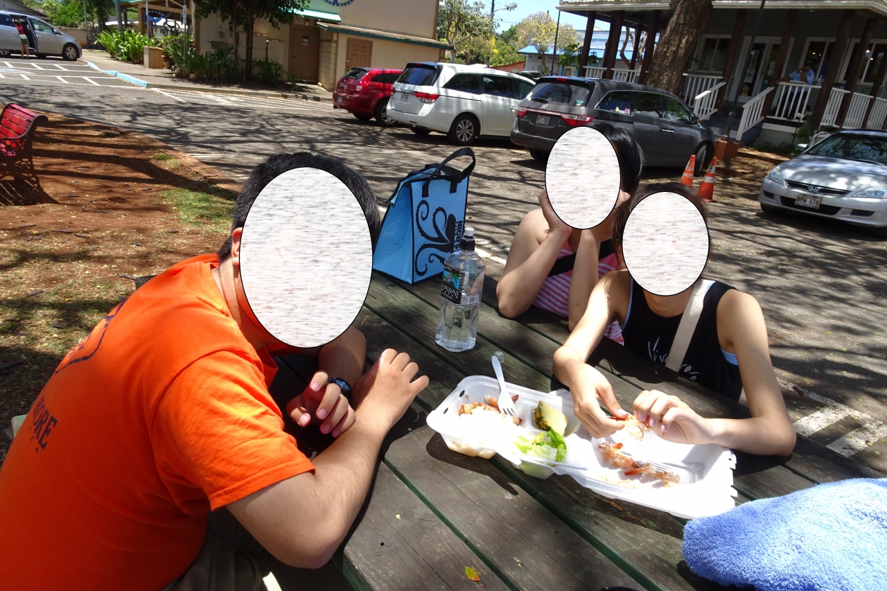 のんびり買い物できます、ノースショアらしい自然に囲まれ、とても情緒と趣があります。パタゴニアやマリンウェア、レストランいろいろあります。何か所かベンチとテーブルがあり、フリフリチキンのテイクアウトやガーリックシュリンプを買い物の合間にいただきます