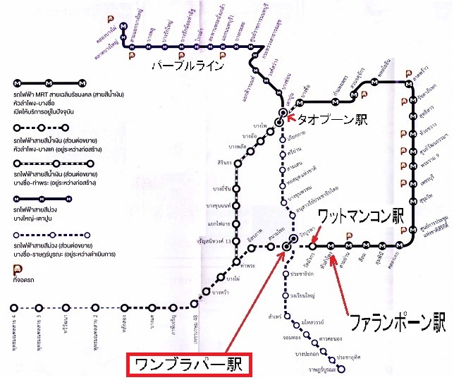 そのパープルラインとファランポーン駅からの地下鉄の延長路線が結ばれるのが、ワンブラパー駅です。