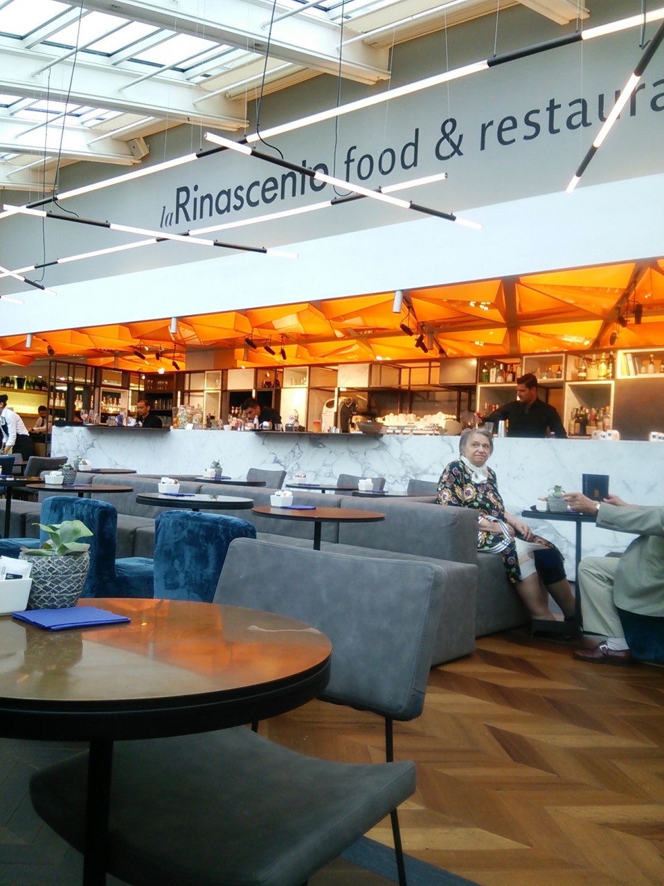 夕方にアペリティーボの時間があり、アルコールを1ドリンク頼むと、プレートに乗ったおしゃれなおつまみが出てきます。買い物に疲れたら7階でひと休みしながらドゥオーモビューを楽しめてとてもよい気分でした。