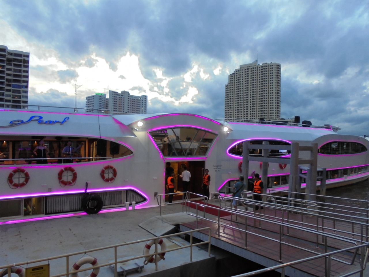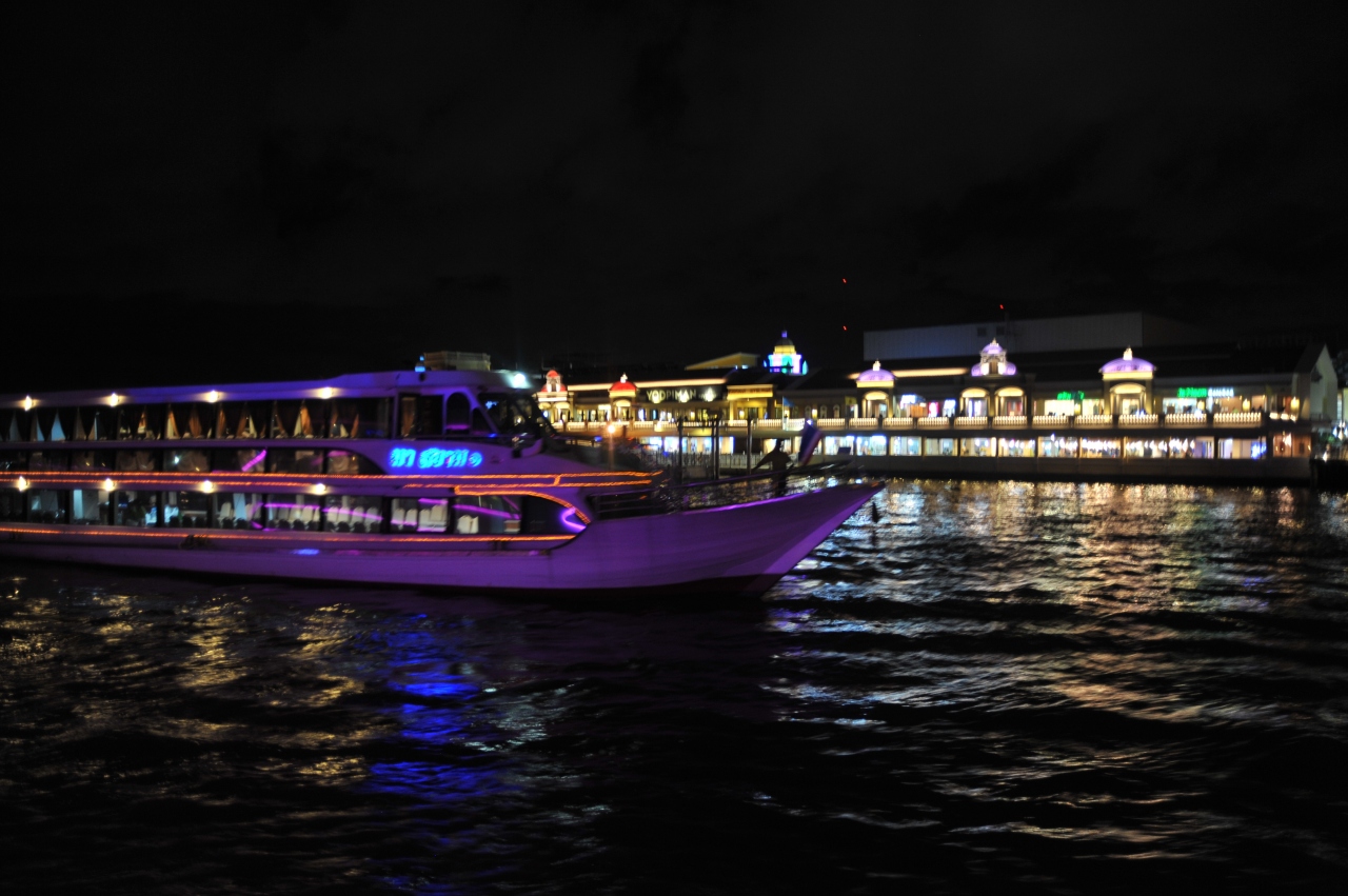 ネットのクチコミで現地のオプションツアー・ディナークルーズを予約しました。ホテルまでの送迎ありを選んだほうが、交通のことを考えることがなく楽でした。船内のディナーはバイキング形式で、タイ料理や洋風や寿司もあり品数は十分過ぎるくらいでした。チャオプラヤー川を行くクルーズ船から眺める景色はとても良かったです。両岸にあるレストランやビル・寺院などがライトアップされて、行き交うクルーズ船も雰囲気を盛り上げてくれるので楽しい思い出になりました。昼間にワット・ポーからワット・アルンまで行く時にもチャオプラヤー川を船で渡りました。川の水はきれいではなかったですが、いろんな船が行き交っている様はとても活気に満ちあふれていると思いました。