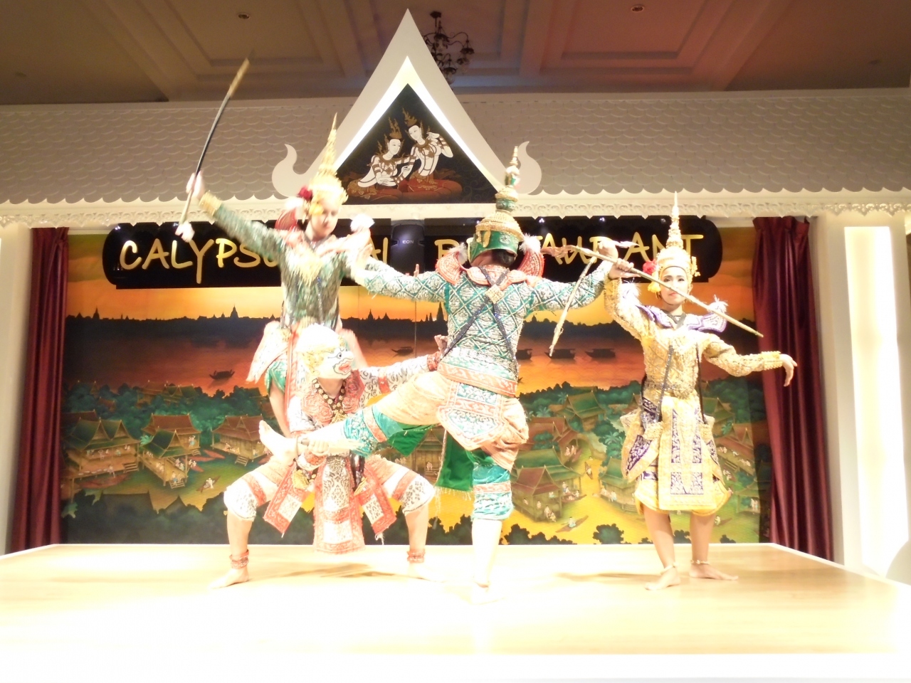 カリプソ劇場がある建物にはタイの古典舞踊ショーも行われる劇場も併設しています。隣の建物にはムエタイの劇場もあります。どちらの建物の一階には小さな網背がひしめき合う商店街になっています。上演時間までに時間があれば、ここでいろいろな店を見て廻るといいでしょう。私はタイの古典舞踊ショーとディナー、ニューハーフショーを一まとめにした現地ツアーをネットで予約しました。日本のツアー会社のオプションは3割ほど割高になっていますから、焦らずにじっくり検討したほうがいいです。ニューハーフショーは、やや内容が古いかなと思います。具体的には、サウンド・オブ・ミュージックのジュリー・アンドリュース似とかマリリン・モンロー似が登場します。60代以上のお客には懐かしいと思えますが、40代以下のお客にはどう映るのでしょうか?さらに斬新な題材を入れてみるのもいいかなと思います。まあ、お笑いが結構ありますから、老若男女を問わず、楽しめるショーだと言えます。