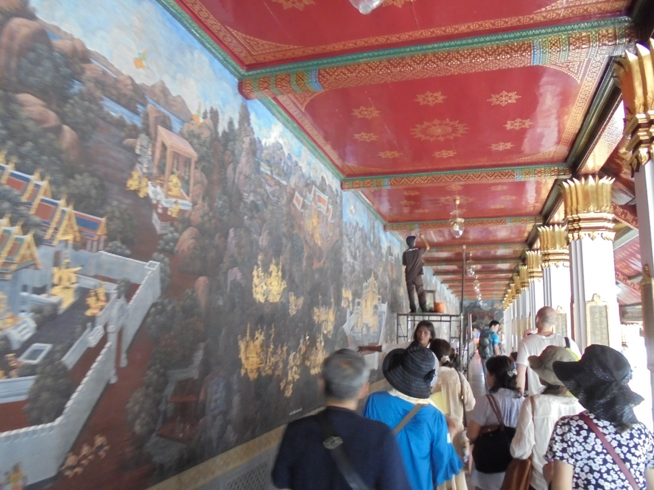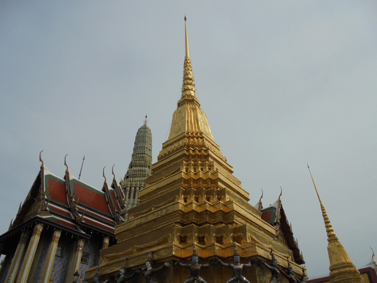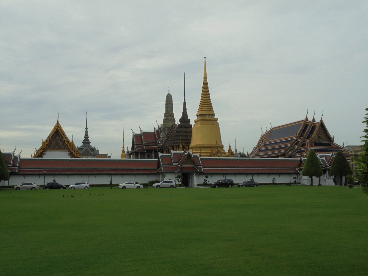 服装チェックが厳しい寺院です。雨季の蒸し暑い中でも、短パンやホットパンツ、サンダル履きは禁止、半袖はOKですが、ノースリーブやタンクトップ、ランニングシャツ姿は入場不可です。ショールなどは貸してくれますが、混雑していると貸し出しはないそうです。チェック箇所は一カ所だけでなく、他にも1・2のチェック箇所もあります。バンコクの寺院の中でも格式の高い神聖な場所だから当然かなと思います。入場口から入って、芝生の大広場があり、黄金の仏塔や寺院の建物が奥のほうに見えます。通路を進むと黄金の仏塔が迫ってきて迫力があります。他の仏塔の壁には色彩豊かな装飾や神聖な像が取り巻いています。蒸し暑くなってきて汗びっしょりになり、人混みも多くなってきて並ぶのが嫌だから、エメラルド仏を見に行く気分になれなかったです。エメラルド仏は撮影できないと聞いていたし、アユタヤでエメラルド仏は見たから、まあいいやとあきらめました。寺院の隣には衛兵が銃を持って建っていました。衛兵と一緒に記念撮影もできます。