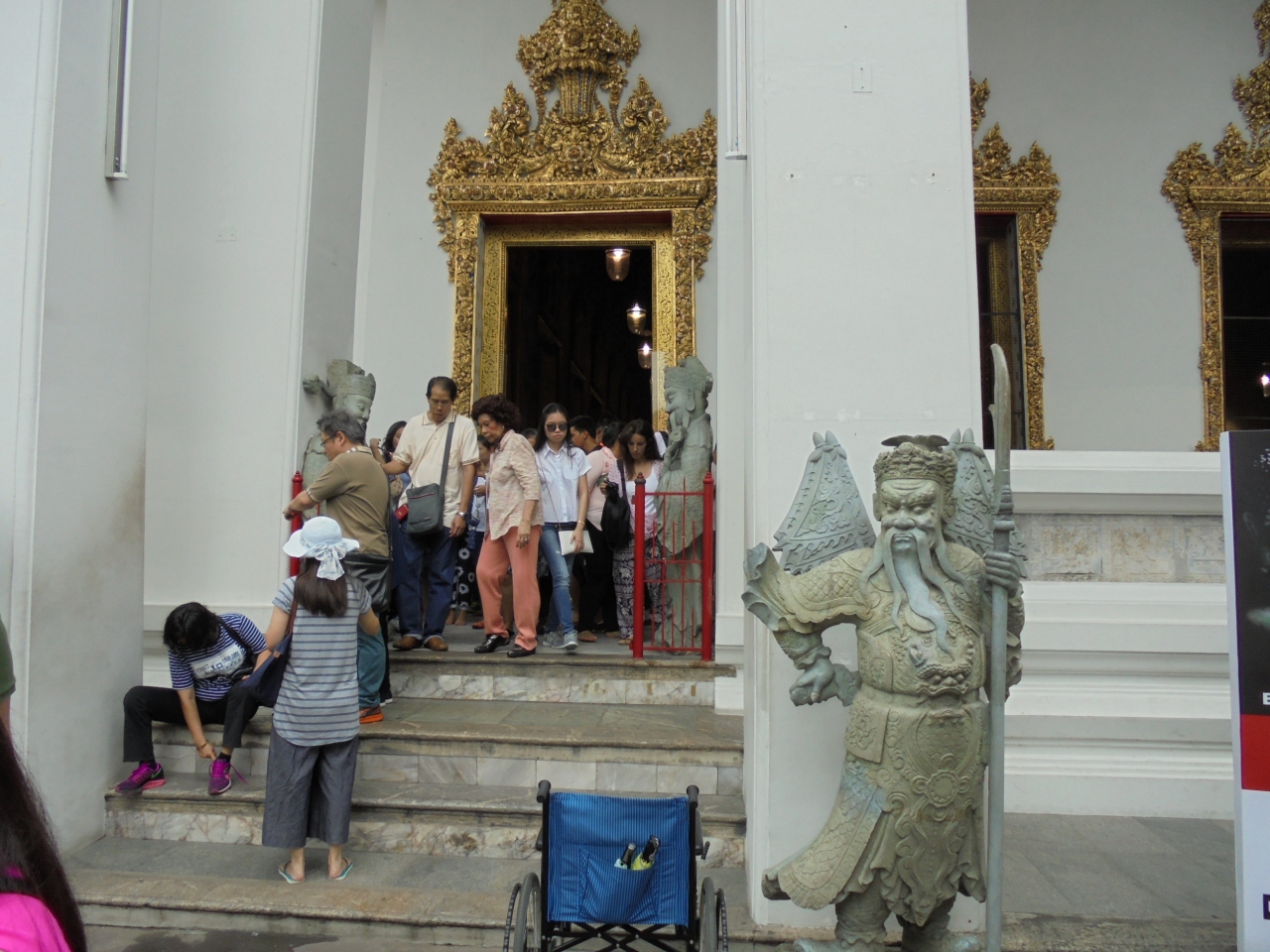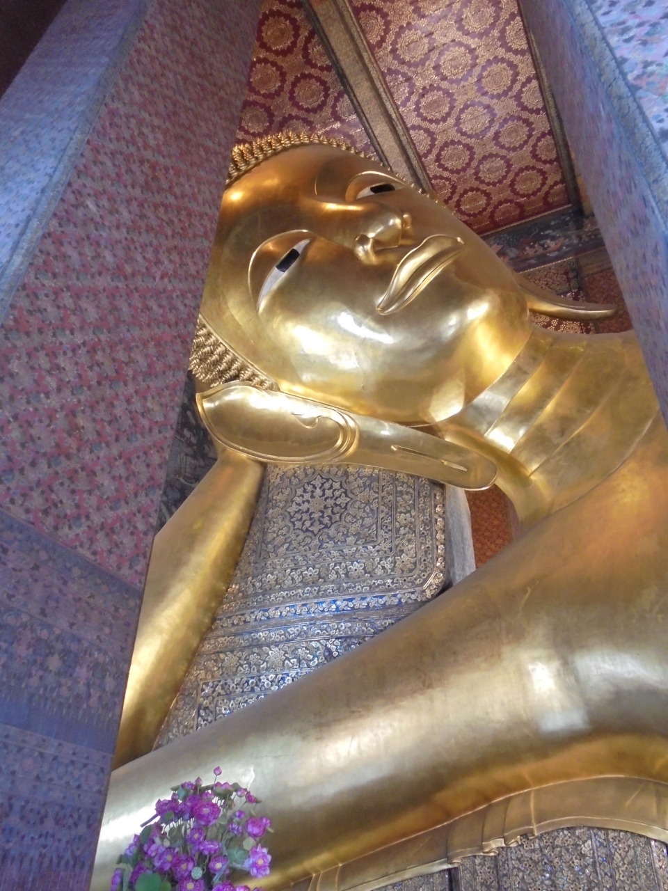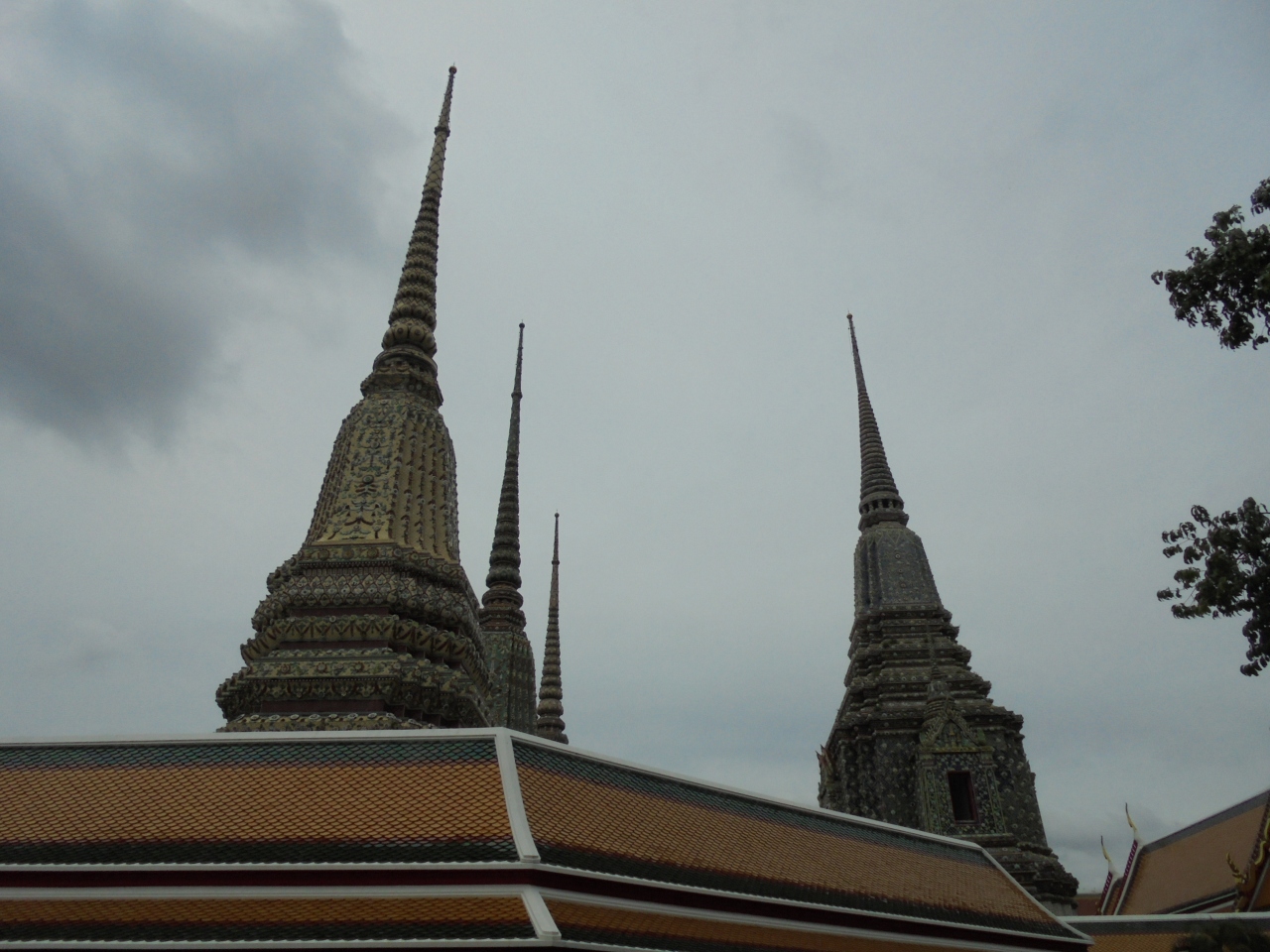 服装チェックが厳しかったワット・プラケオに比べれば、ここワット・ポーは服装にはあまりうるさくないです。男性は短パン・半袖でもOKです。女性はノースリーブやタンクトップやミニスカートは注意されるかもしれません。入り口から入ると煌びやかではないけどいくつかの仏塔が見えます。寝釈迦仏のある建物はどこにあるかは、現地ガイドさんが教えてくれなければ分かりにくいと思います。寝釈迦仏のお堂に入るには靴と帽子を脱ぎます。お堂に入ると、まず目に飛び込んでくるのは、寝釈迦仏の大きなお顔です。左右には柱があるので、お顔の部分だけの撮影は少し工夫がいります。足元はその時は修復中でしたので、一旦お堂の外の通路に出て、金網がある窓から足元を見ることになります。修復中の写真は珍しいと思いますから、写真は必ず撮ったほうがよいです。境内には無料のトイレがあります。とてもきれいで冷房も効いていますので快適です。ただ、トイレを済ませた後、来た方向が分かりにくく迷うかもしれませんので、集合場所をよく確認しておいたほうがいいでしょう。