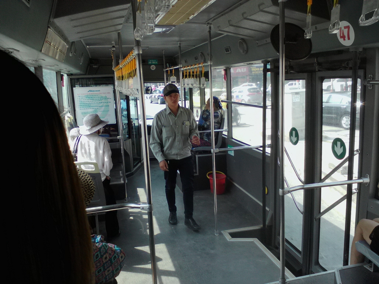 一度路線を知ってしまえばこんなに便利で安い移動手段はありません。全ての路線かどうかはわかりませんが料金は1回の乗車につき7000ドン。車体の窓などにもしっかりと表示されています。 バスに乗り込んだ後に車掌から切符を買います。試しに車掌が来た時にいくら?と聞いてみたらしれーっとした顔で1万ドンと。切符にもちゃんと7000ドンと書いてあるのに一体どういうつもりなんでしょうか。アホすぎます。