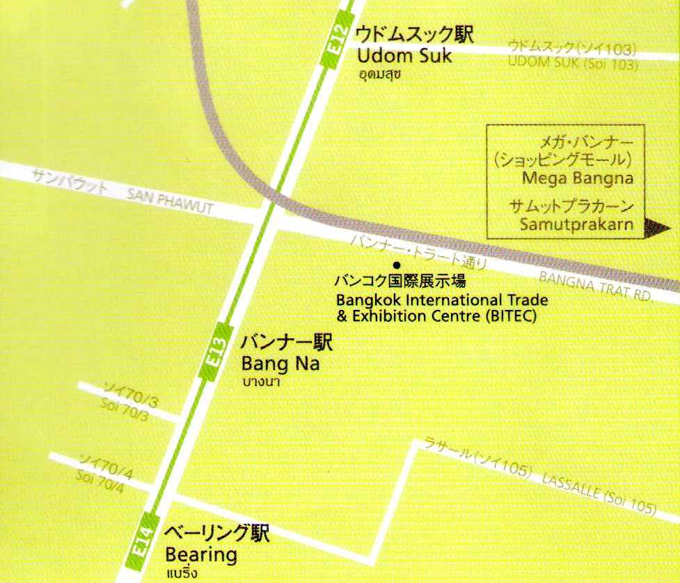 北隣のウドムスック駅との間に、高速道路が走っているとともに、バンコク国際展示場があります。