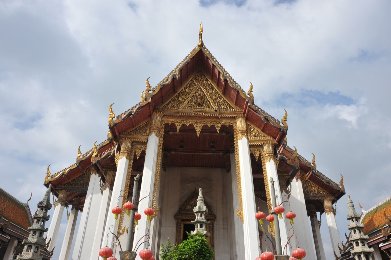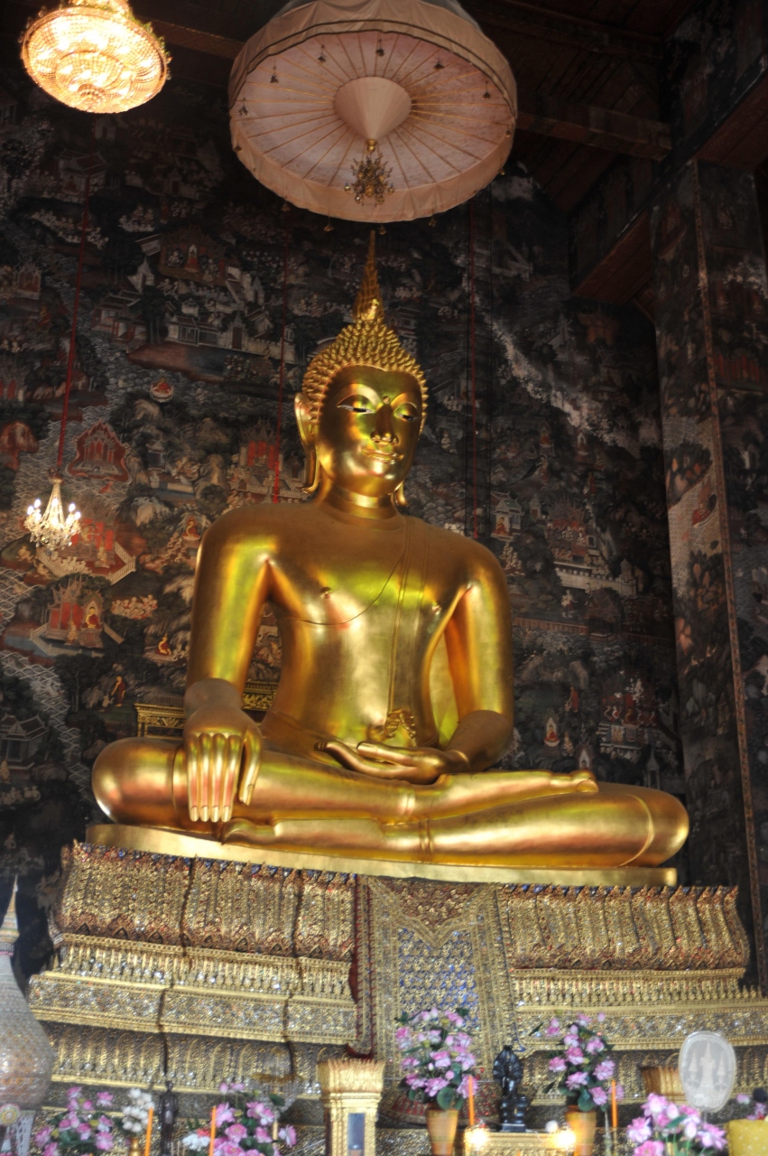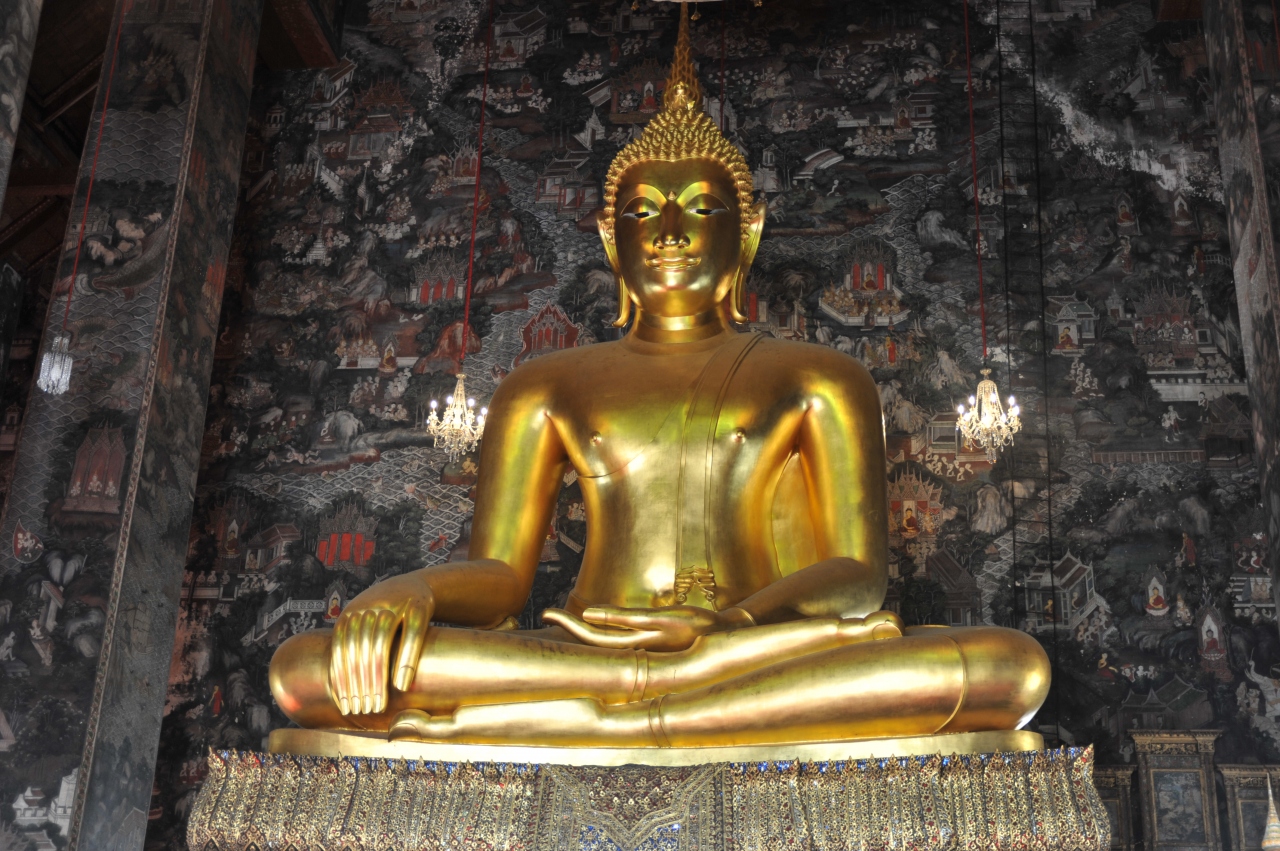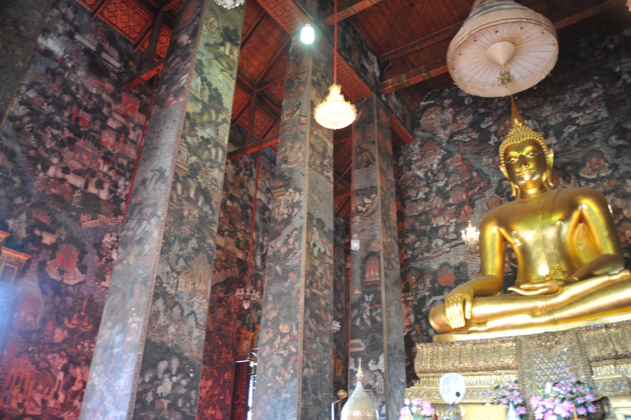 この寺院は観光客にはあまり知られていないようで、観光客は私達と校外学習で来ている生徒と地元の信者くらいだけでした。ゆったりとした気分で寺院を巡ることができました。まず、靴を脱いでお堂の中に入ります。中には、黄金に輝く大仏が鎮座してあります。奈良の大仏の大きさの2/3位の大きさですが、荘厳な感じがしました。お堂の中の柱や壁にはかなり古い仏教の絵がびっしりと描かれています。お堂の周りには回廊があり、その中には黄金色の仏像がずらっと並んでいます。そこには地元の学校の生徒がお坊さんの説明を熱心に聞いていました。歴史が古くて由緒正しい寺院だと思います。