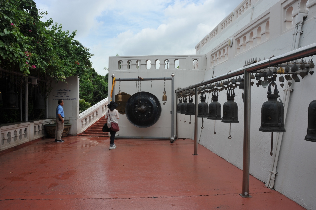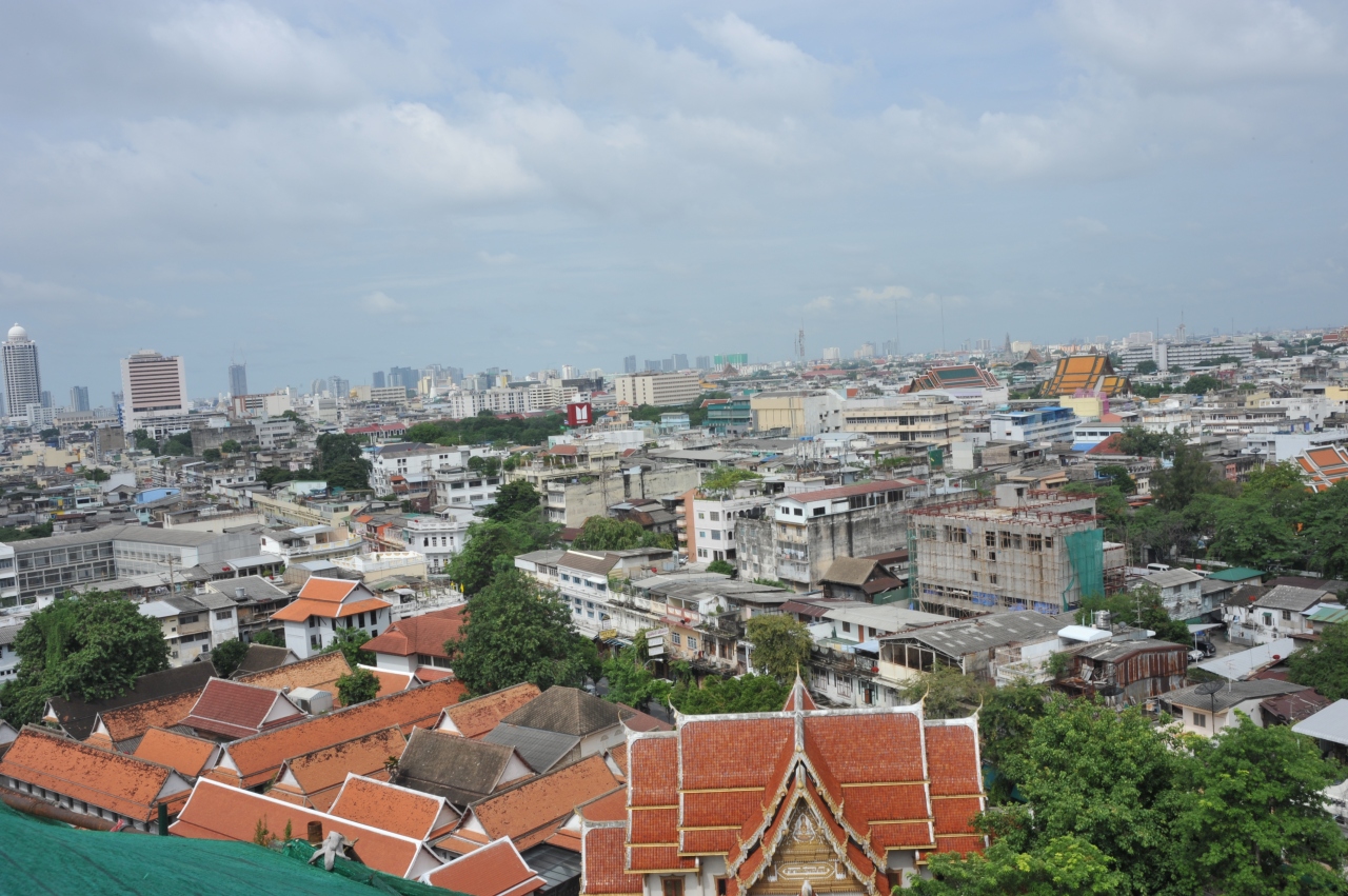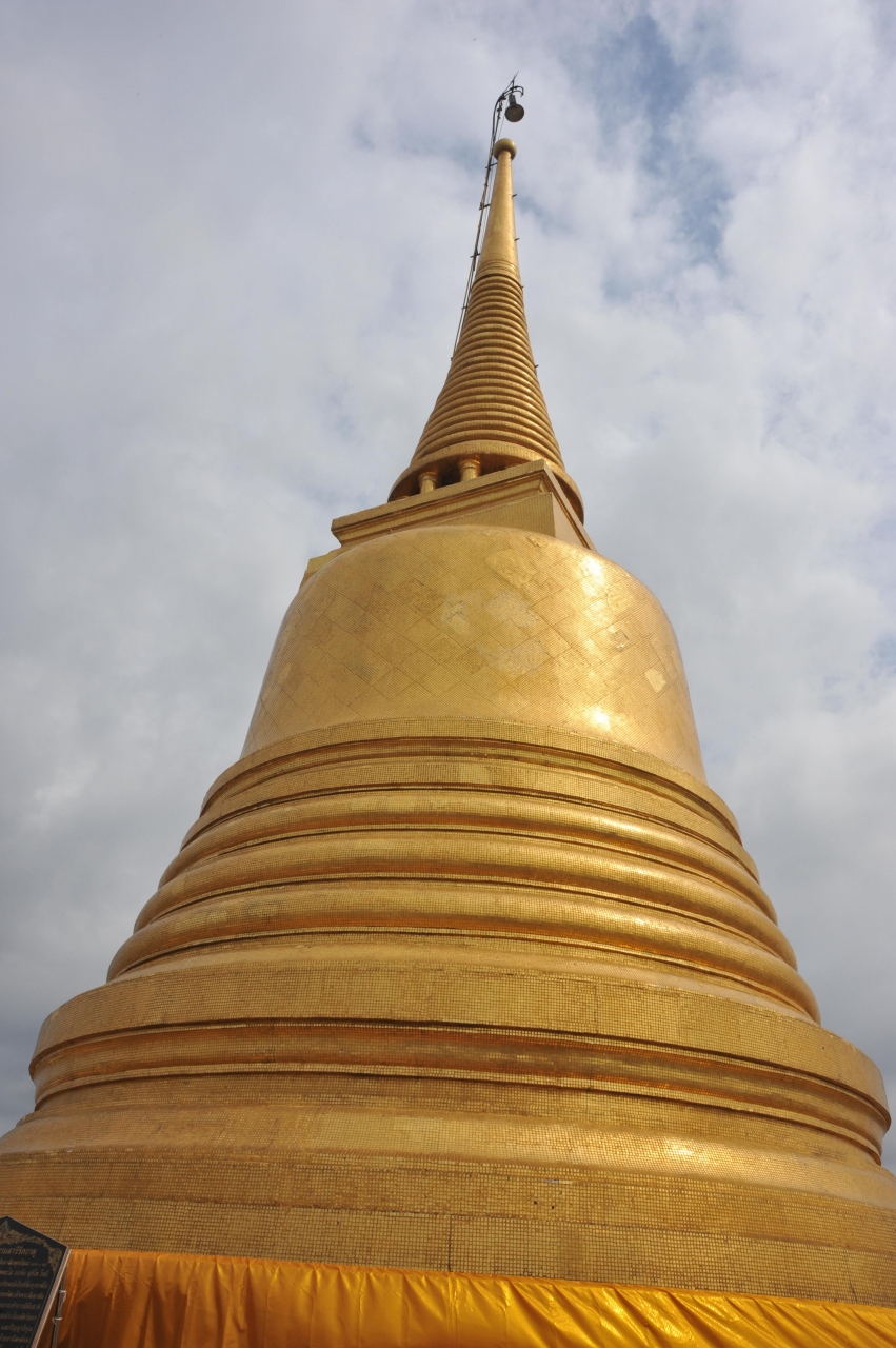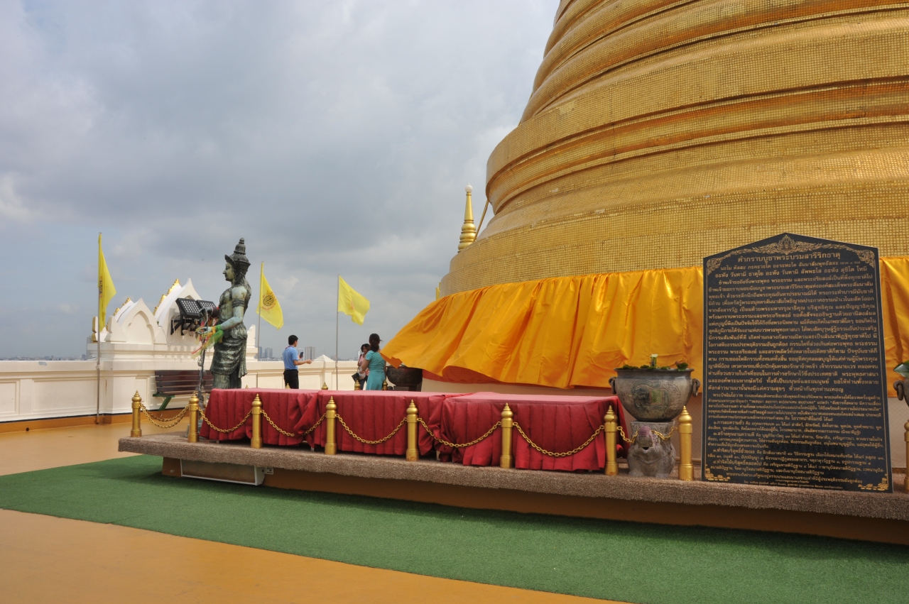 この寺院はバンコク市内の観光スポットとしては三大寺院に比べてあまり紹介はされていないので、観光客はとても少ないのでゆったりと観光できます。ただ、階段が半端ではないので、歩きやすい靴でないときついです。服装チェックはありません。階段を上がり始めると、見ざる・言わざる・聞かざるの3匹の猿の置物が出迎えてくれます。日光の東照宮にある猿を思い出しました。階段をさらに上っていくと螺旋階段になり傾斜もきつくなります。大仏塔の真下にある階の中央には四方向を向く四体の仏像が鎮座しています。仏舎利(仏陀の遺骨)がここに納められているとのことです。さらに上の階へ行くとテラスになっていて、バンコク市街を360度眺められるパノラマ風景が広がります。黄金色に輝く仏塔も荘厳な雰囲気を持っていて圧巻です。