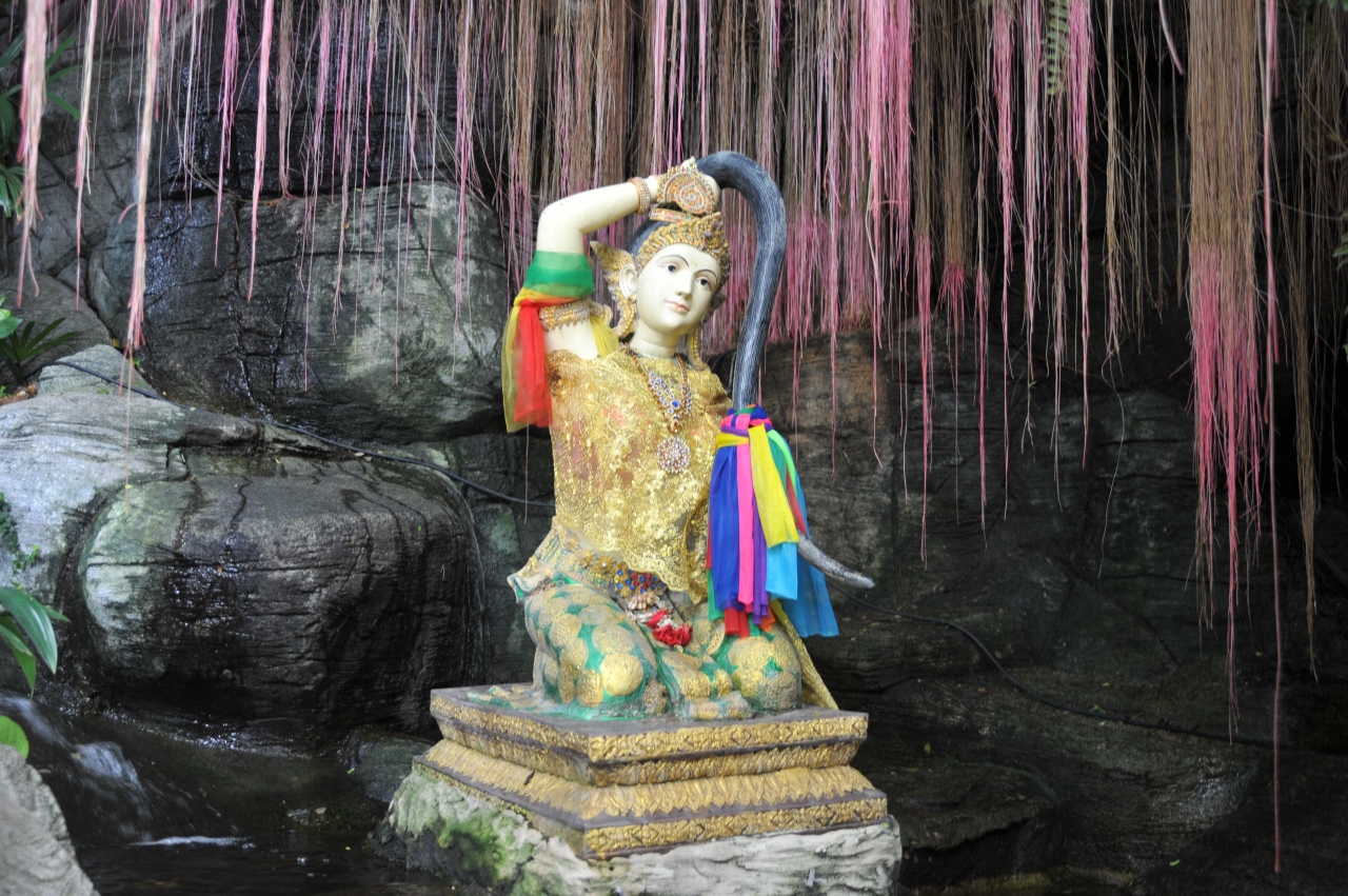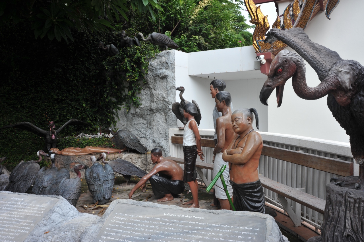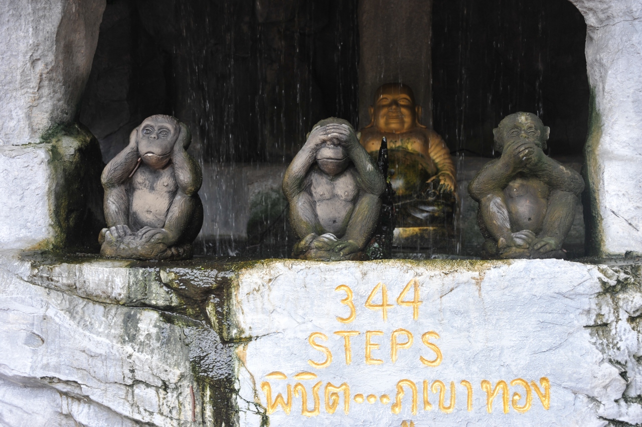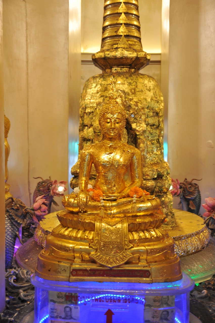 この寺院はバンコク市内の観光スポットとしては三大寺院に比べてあまり紹介はされていないので、観光客はとても少ないのでゆったりと観光できます。ただ、階段が半端ではないので、歩きやすい靴でないときついです。服装チェックはありません。階段を上がり始めると、見ざる・言わざる・聞かざるの3匹の猿の置物が出迎えてくれます。日光の東照宮にある猿を思い出しました。階段をさらに上っていくと螺旋階段になり傾斜もきつくなります。大仏塔の真下にある階の中央には四方向を向く四体の仏像が鎮座しています。仏舎利(仏陀の遺骨)がここに納められているとのことです。さらに上の階へ行くとテラスになっていて、バンコク市街を360度眺められるパノラマ風景が広がります。黄金色に輝く仏塔も荘厳な雰囲気を持っていて圧巻です。