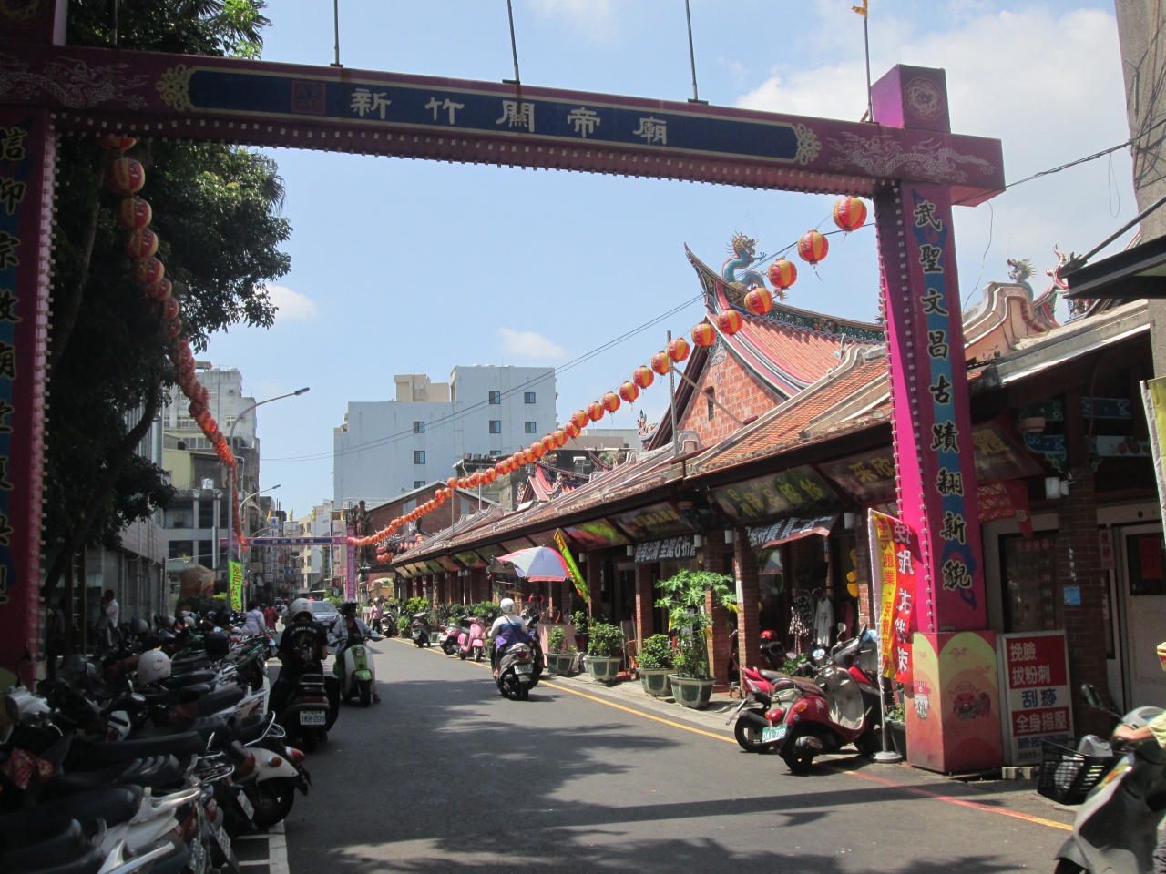 新竹市街の中心にある通りで狭い道路です、通り沿いに新竹開帝廟があり、通りに入口の門があります、周辺には商店が並んでいます、小さな公園もありました、道の終点前には新竹中央市場があり、都城隍廟内に行くことが出来ます。