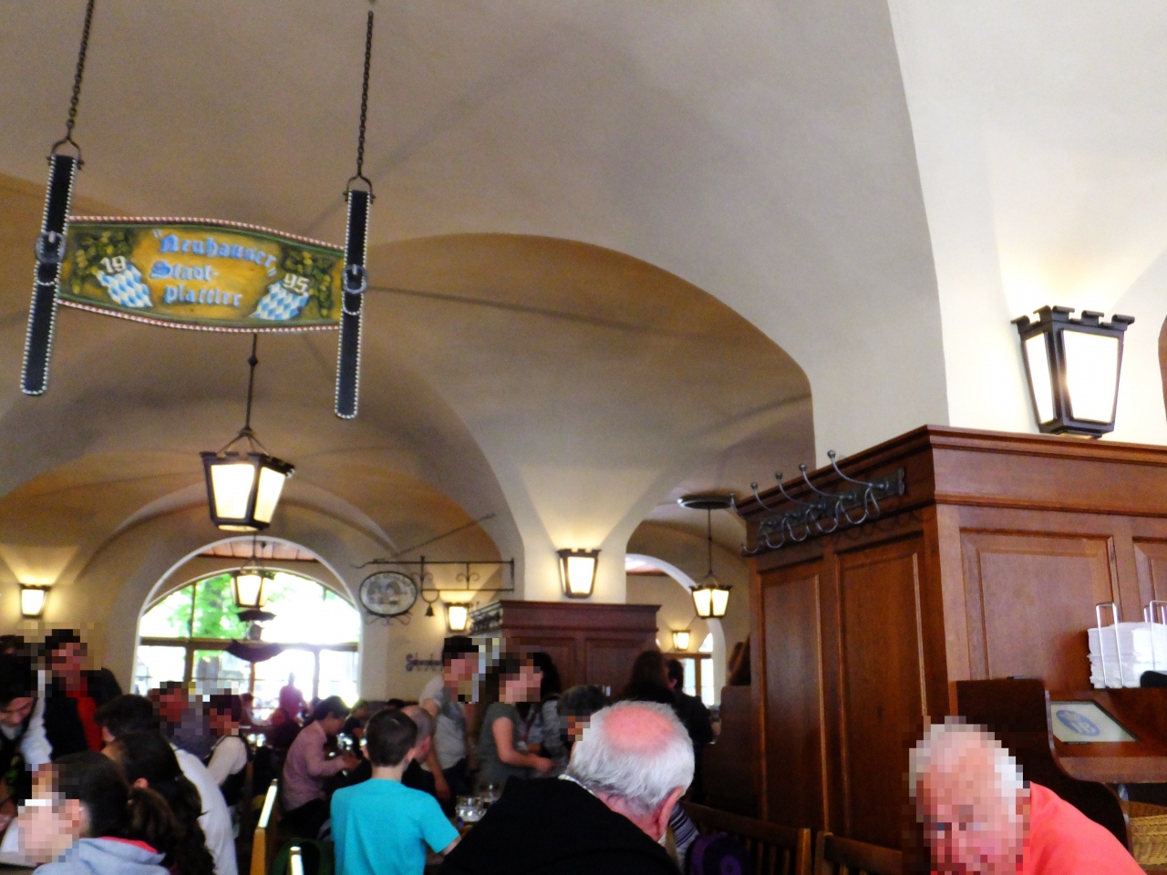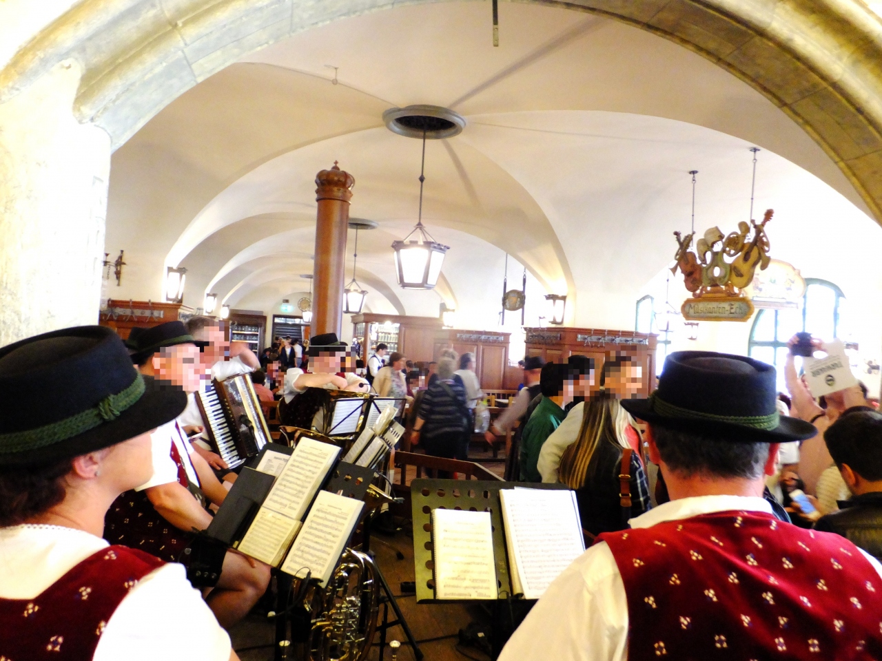 席を開けてくれたドイツ人の家族連れは、お父さんが酔ってきたのか、バンドに合わせてうつむいたまま長椅子をバンバンたたいて拍子を取り出すといった陽気な雰囲気のビアホールです。