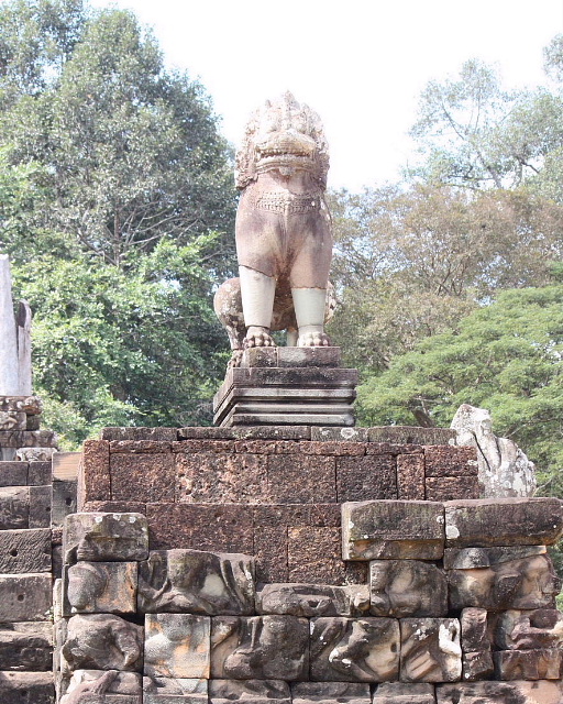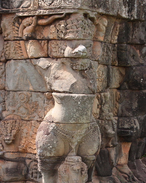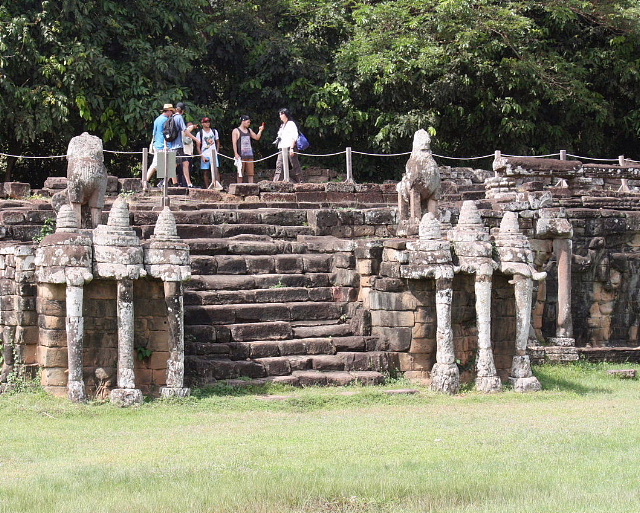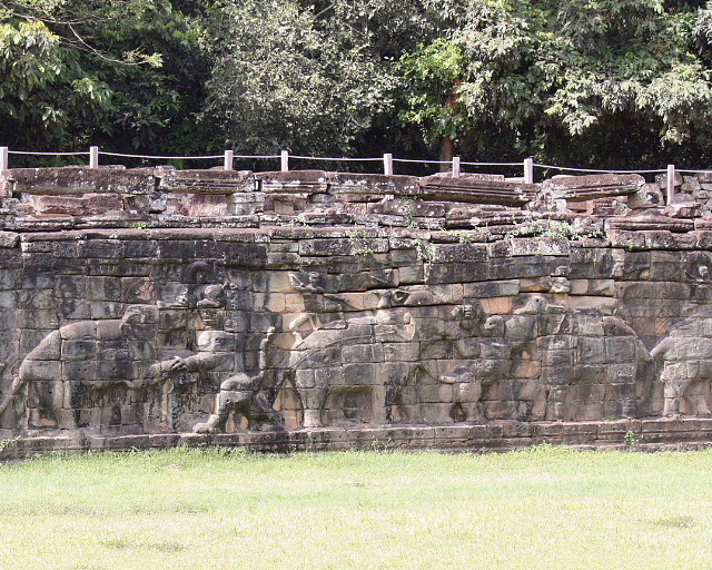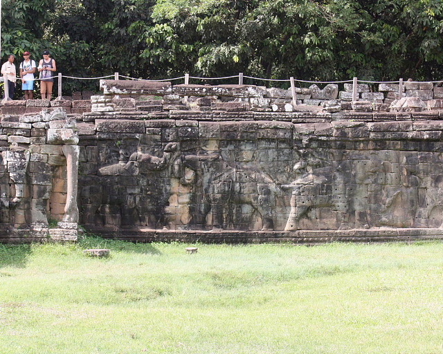 「象のテラス」は王宮前広場に面して南北方向に延々と続く長大なテラスの呼び名である。十二世紀後半、ジャヤヴァルマン七世によって作られ、王族の閲兵などに使われた。高さ三メートル、長さは三百メートル以上もあり、テラスの上にはナーガの欄干がある。側壁にはその名のとおり象のレリーフが見られる。レリーフの主題は主に象による狩の様子である。テラスの北側の側壁にはガルーダのレリーフがある。またテラスに付属する階段の両脇には、象の頭部を模した装飾がある。建築様式はバイヨン様式に属するそうです。
