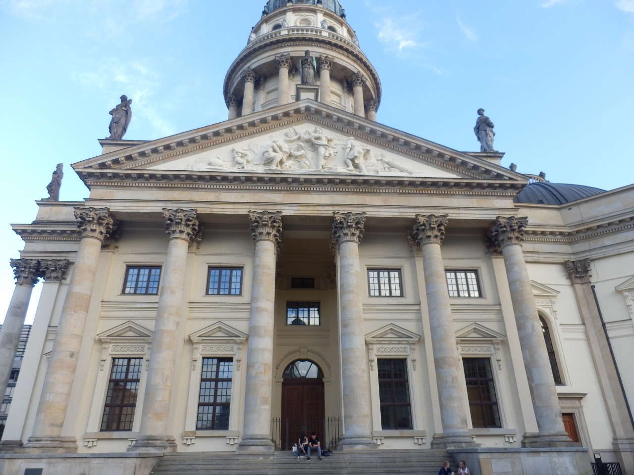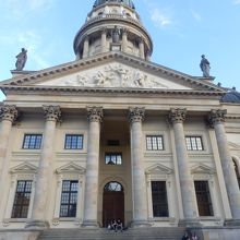 ジャンダルメンマルクト広場の南北に2つのドームが対になって建って いますが、こちらのドイツドームは南側に建つ方です。2つのドームは外観がとてもよく似ていますが、私はドイツドームの方が立派で美しく感じました。残念ながら、訪れたのが夜遅くだったため、建物の中には入れませんでしたが、広場には観光客が大勢訪れていました。