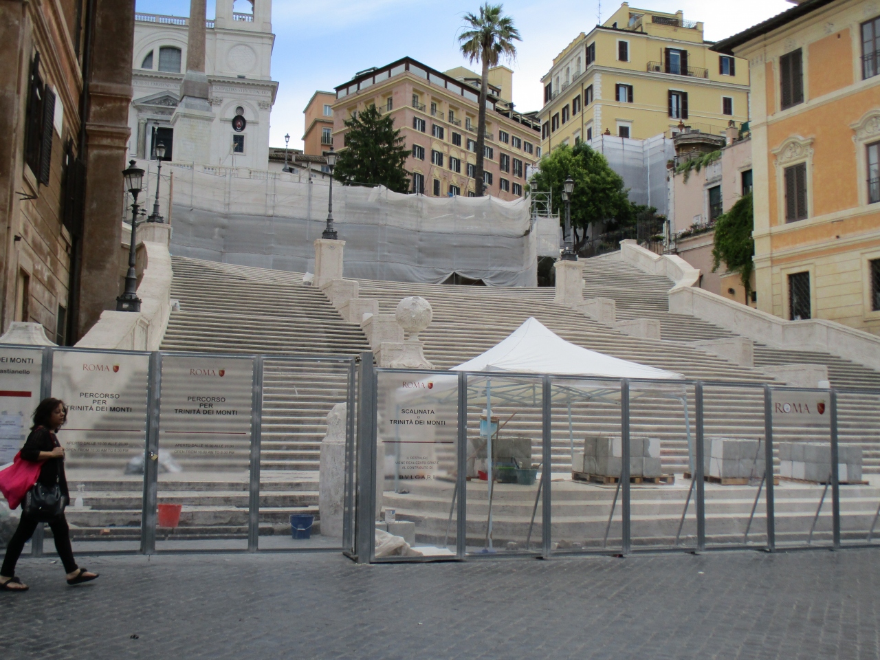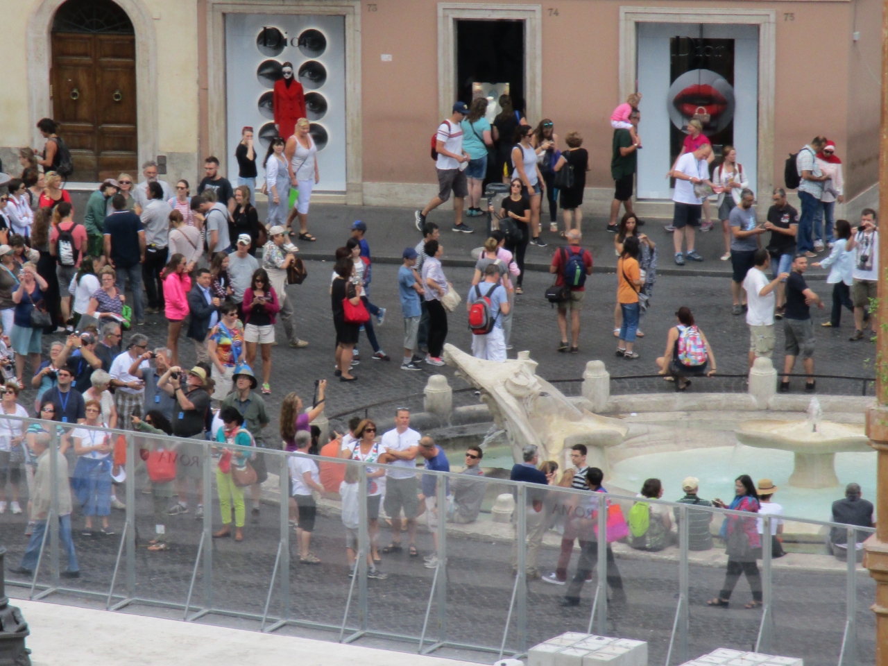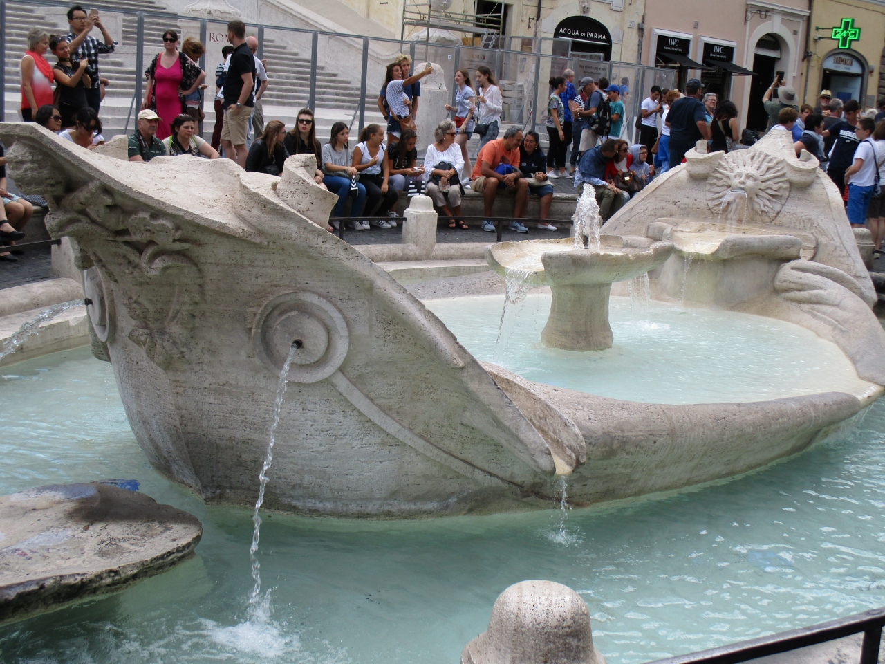 ここへ来たのも30年ぶり2回め、当時のことはあまりよく覚えていませんが、「ローマの休日」を思い出して階段を上り下りした記憶はあります。今回、日本出発前からわかっていたのですがスペイン階段は工事中で通行禁止、残念ですが仕方がありませんね。階段の上へも行きましたが、トリニタ・デイ・モンティ広場も工事中、そのまま遠回りして下へ降り、スペイン広場へ行きました。よく晴れた日の11時頃、有名なベルニーニ作「舟の噴水」の周りは多くの観光客で賑わっていました。広場のすぐ近くには多くのブティックがあり、ウィンドウ・ショッピングも楽しめるので、狭い通りも人通りが絶えませんでした。
