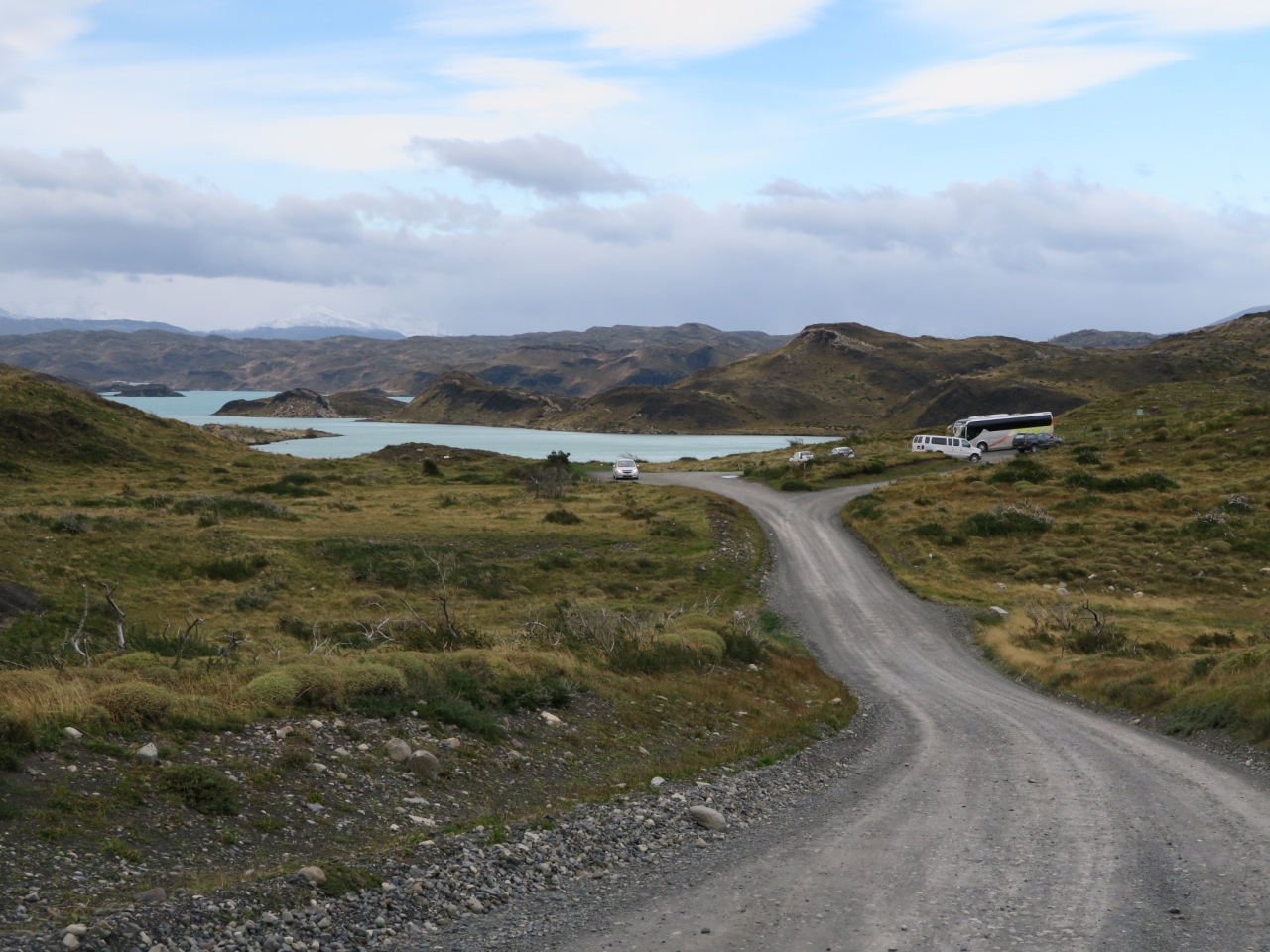プデートのバス停からペオエ湖の湾に沿った坂道を上ってツアーバスなどが停まる駐車場まで約10分、そこからさらに約10分で片道トータル約20分です。
