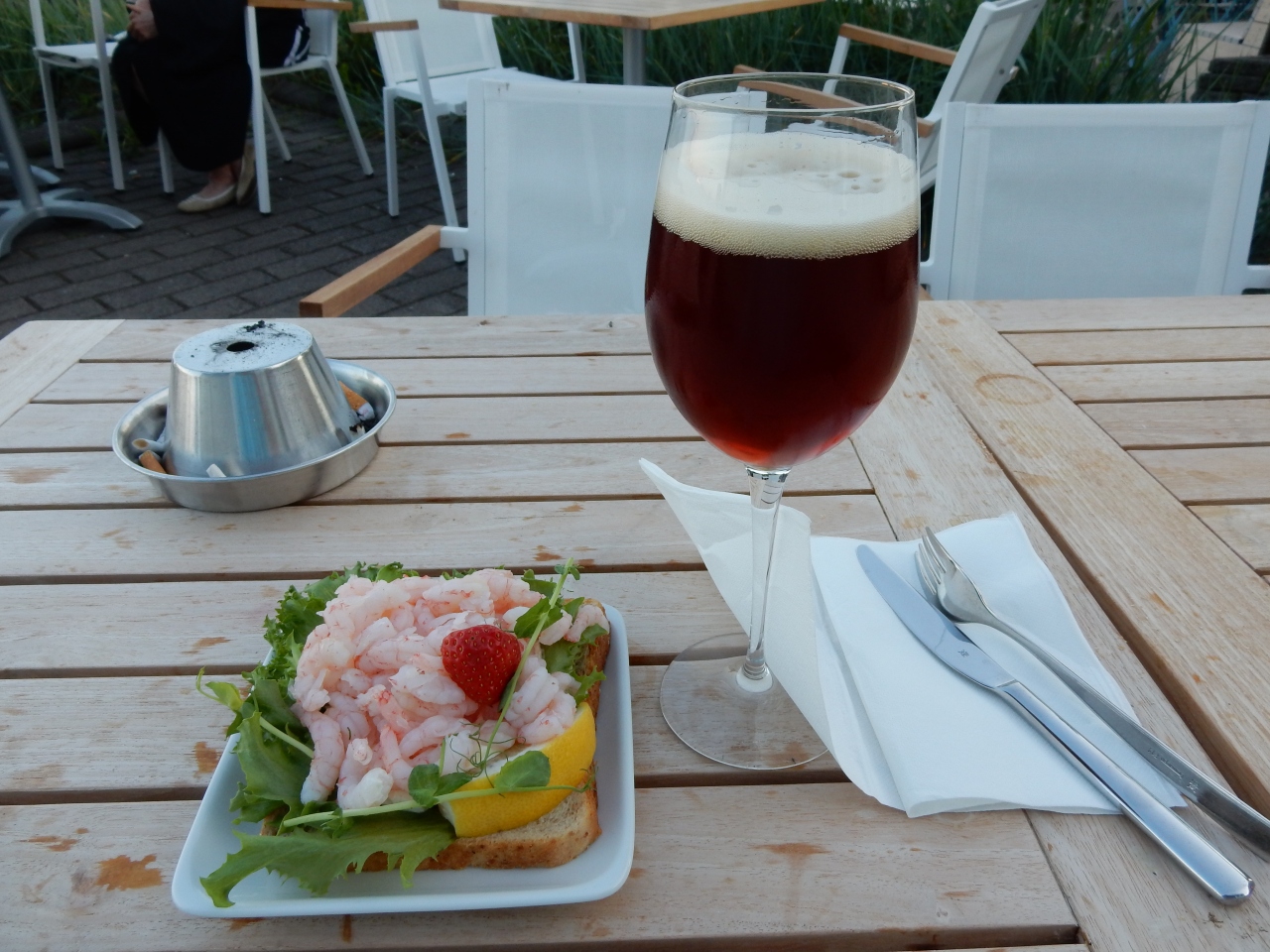 小エビのオープンサンドとカフェ・ウルスラの地ビール合計で17ユーロでした。