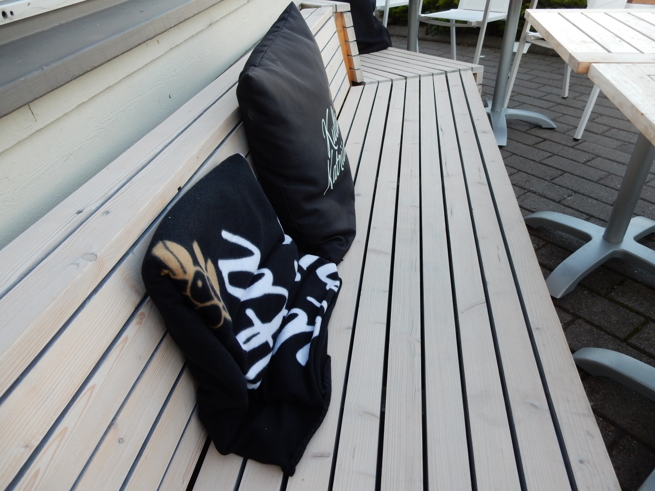 外の座席は涼しいので、肌掛けやクッションも置かれていました。