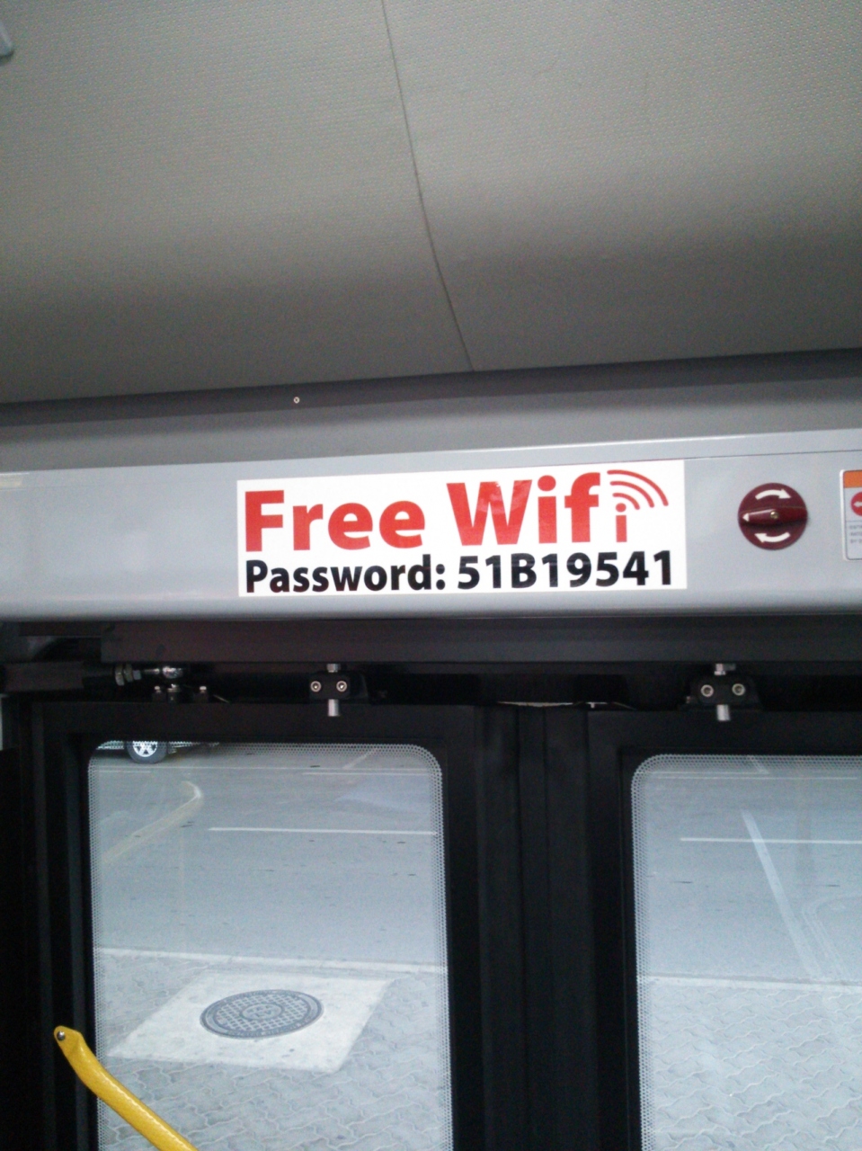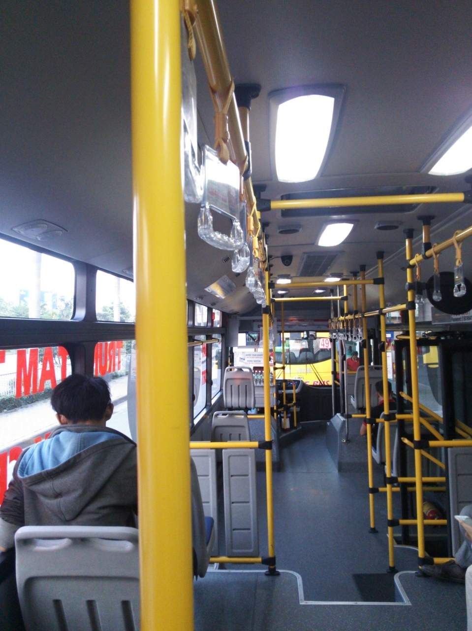 黄色の車体で、まだ運行し始めたばかりの新しいバスです。車内は、冷房完備、Wi-Fiも利用できます。
