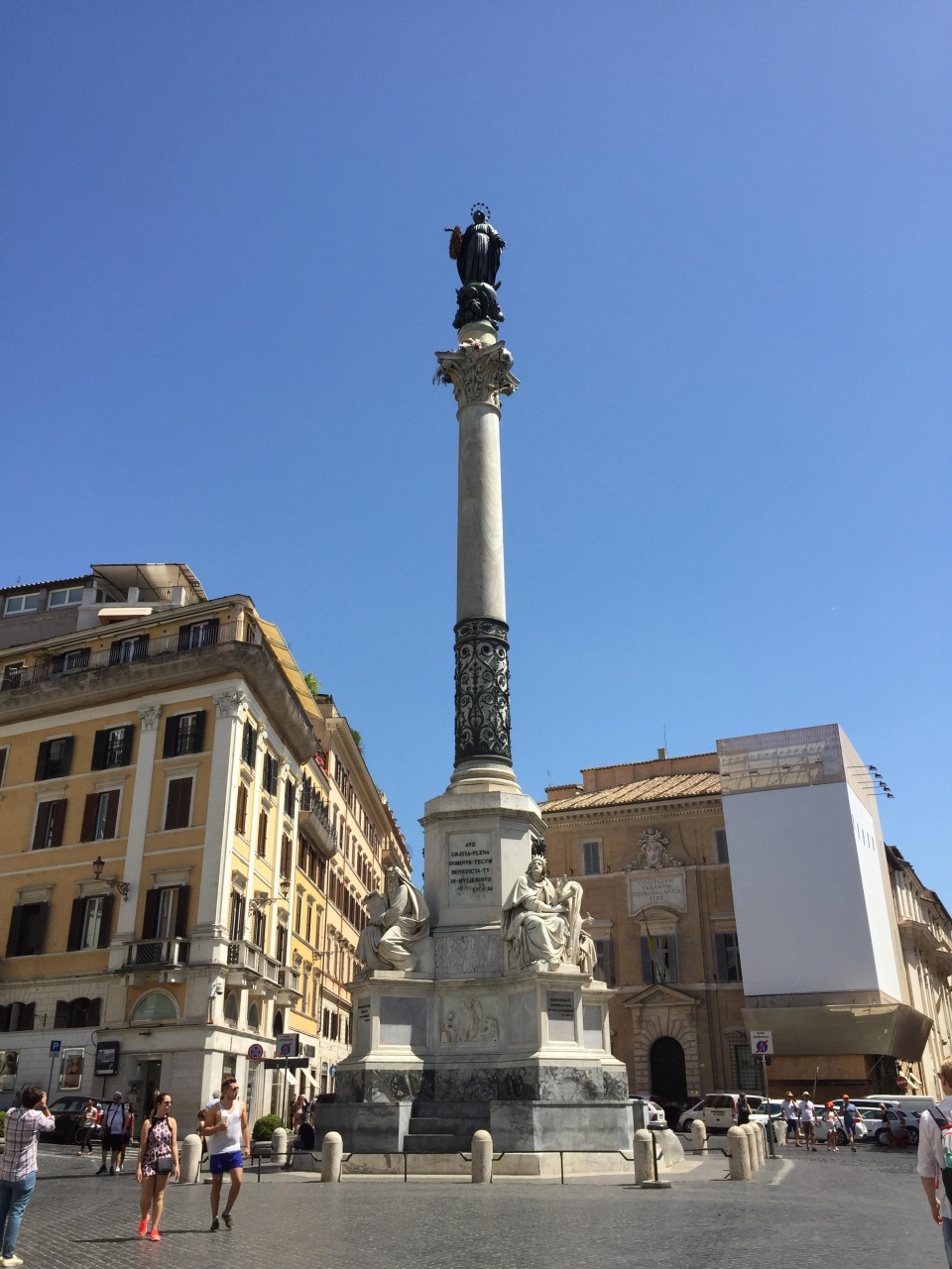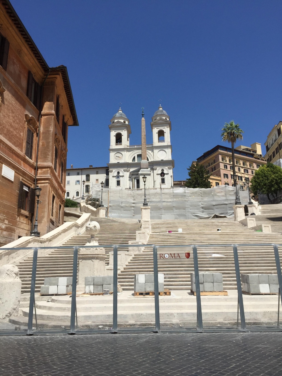 日本を出発する時からわかっていたので、階段が閉鎖されていたのを見ても落胆はしませんでした。せっかくなので、だ~れもいない階段をじっくり眺めてきました。暑い中、作業をしていらっしゃる方々が数人見えました。修復が終わったら、ぜひまたこの場所に来たいな!と思いました。広場からの道は、ブランドショップが立ち並ぶ賑やかな通りでした。