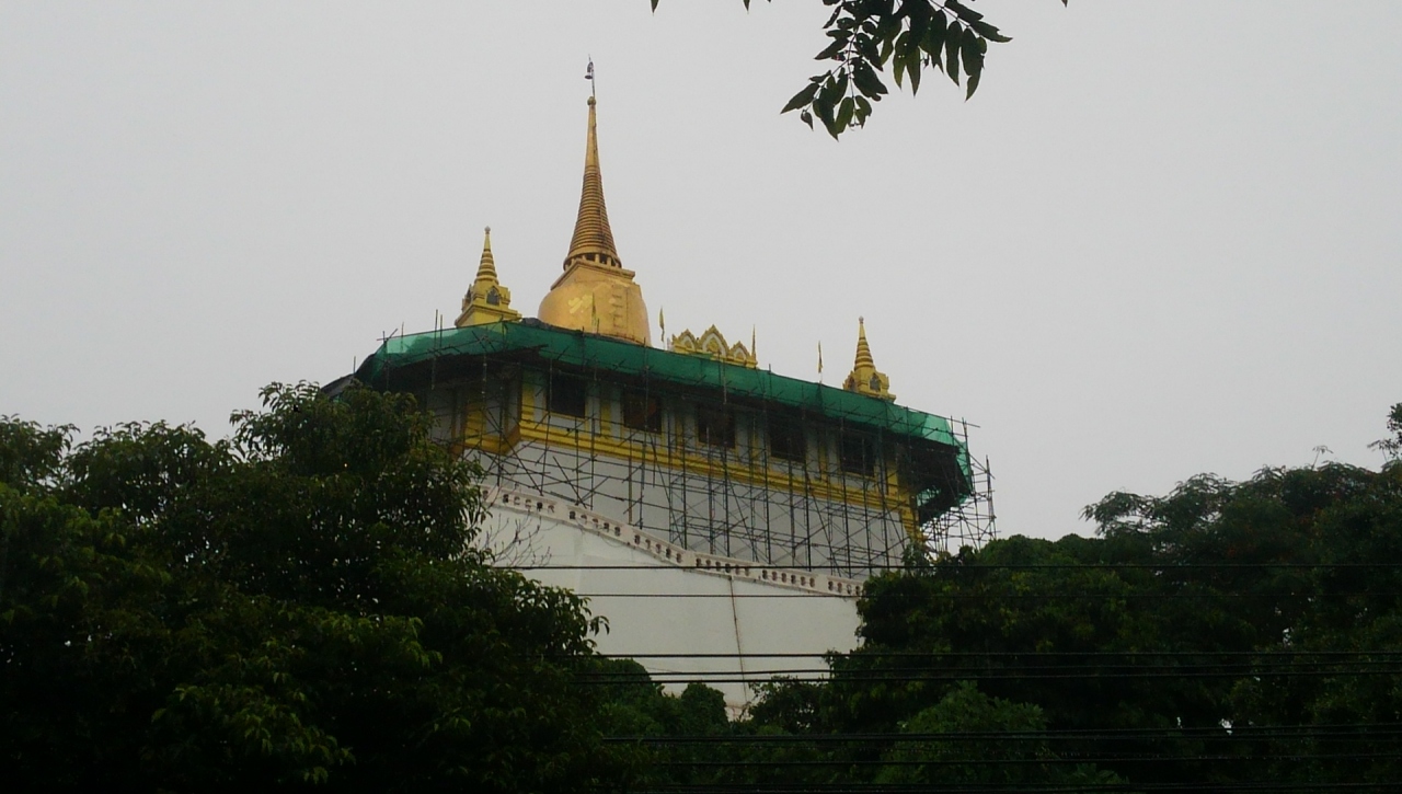 丘の上にそびえ立つ金色の仏塔、プー・カオ・トーンが有名な寺院です。