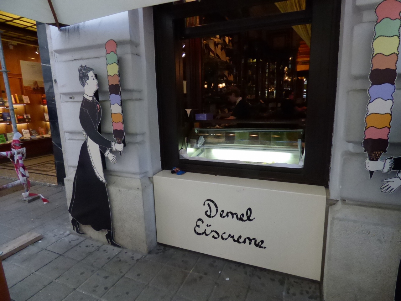王宮を見学したあと、コールマルクト通りに面するデーメルに行ってみました。前日にカフェザッハーでザッハートルテを食べていたので、評価を二分する名店であるデーメルでも食べたいと思っていましたが、このお店はやはり混雑が激しい。結局アイスのテイクアウトになりました。