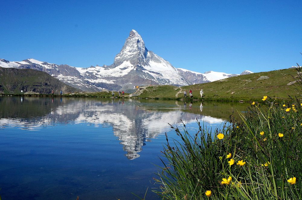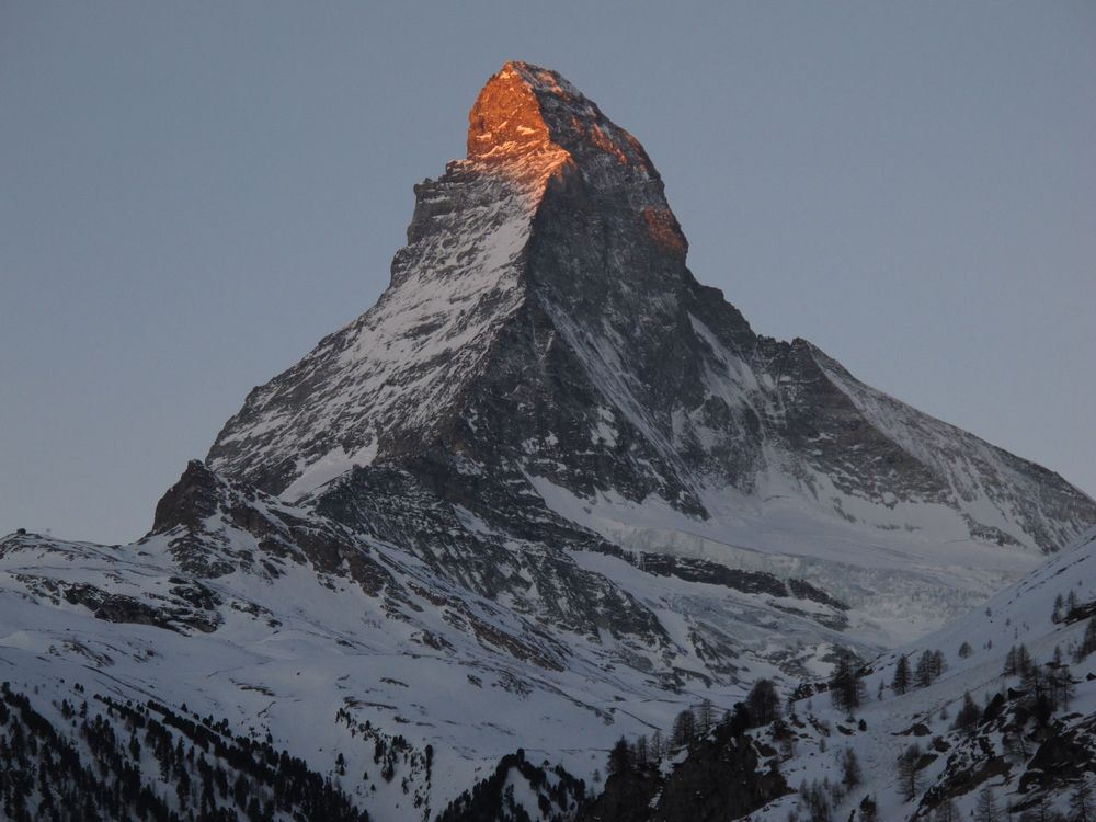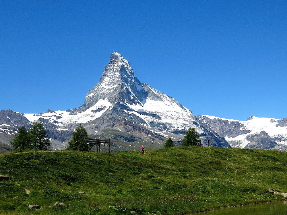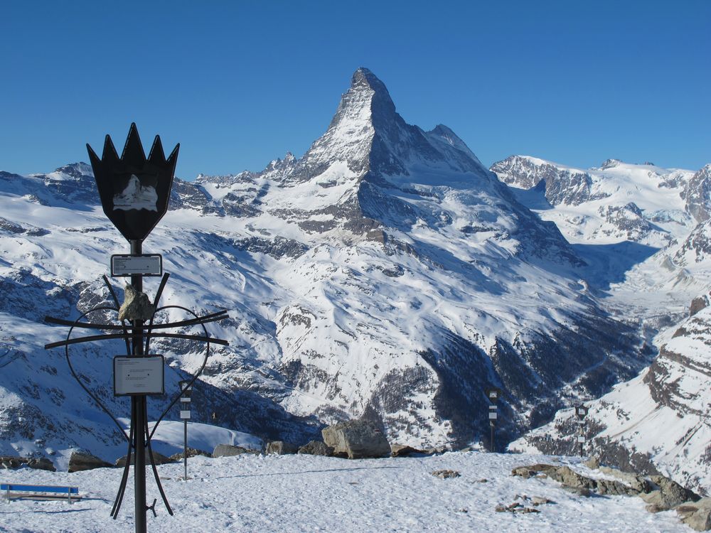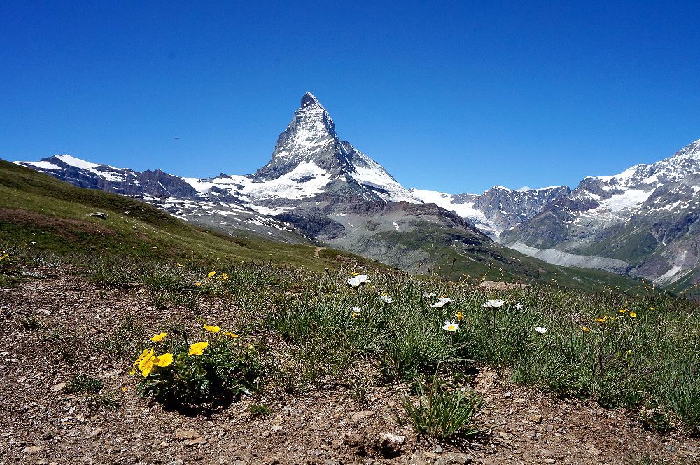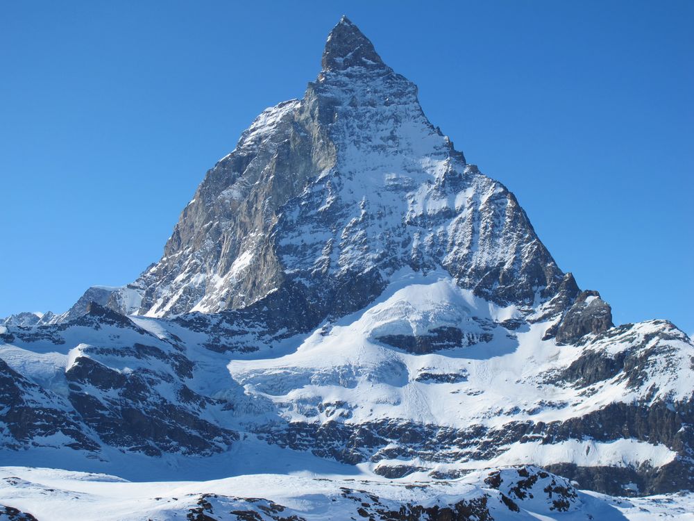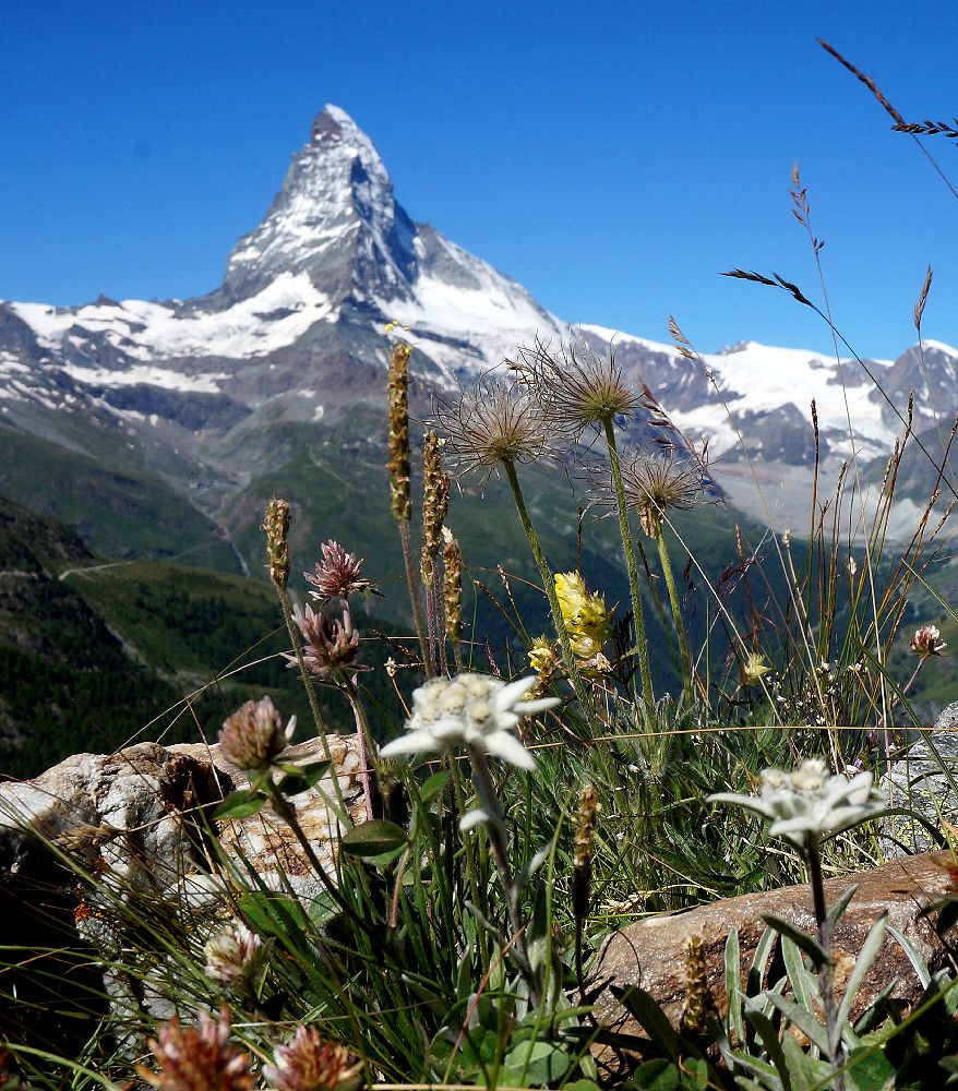 ツェルマットへは夏冬合わせて4回訪れていますが、マッターホルンの姿は何度見ても感激します。見る場所によりその姿は様々に変化しますが、どの形もすばらしく、とにかく圧倒されました。今年(2016年7月)は、毎日快晴に恵まれ、一日目はローテンボーデンからリッフェルアルプ、2日目はブラウフェルトからスネガの駅まで歩いたのですが、二日間ともずっとクリアな山容を眺めることになりました。そして二日連続で逆さマッターホルンも満喫しました。さらに二日目には初めてエーデルワイズに出会い、マッターホルンとエーデルワイズのツーショットもかないました。その前日には、アニヴィエの谷のSt-Lucからのトレッキング中に、ツェルマットからとはまた違う姿のマッターホルンを見ることもできて、最高でした。冬に訪れた時も快晴の天気で、夏とはまた違った姿を見せてくれました。何度見てもすばらしい山です。