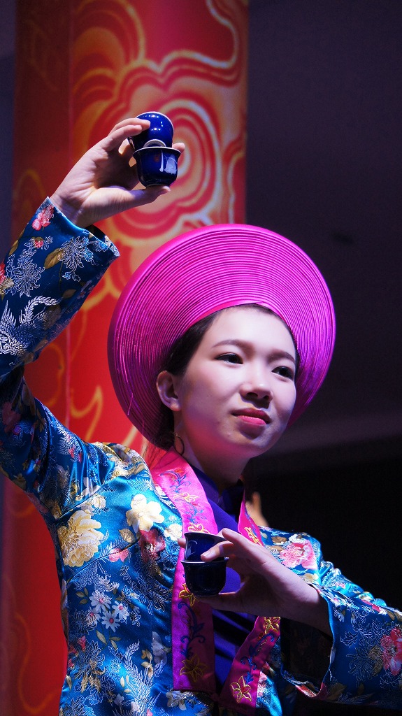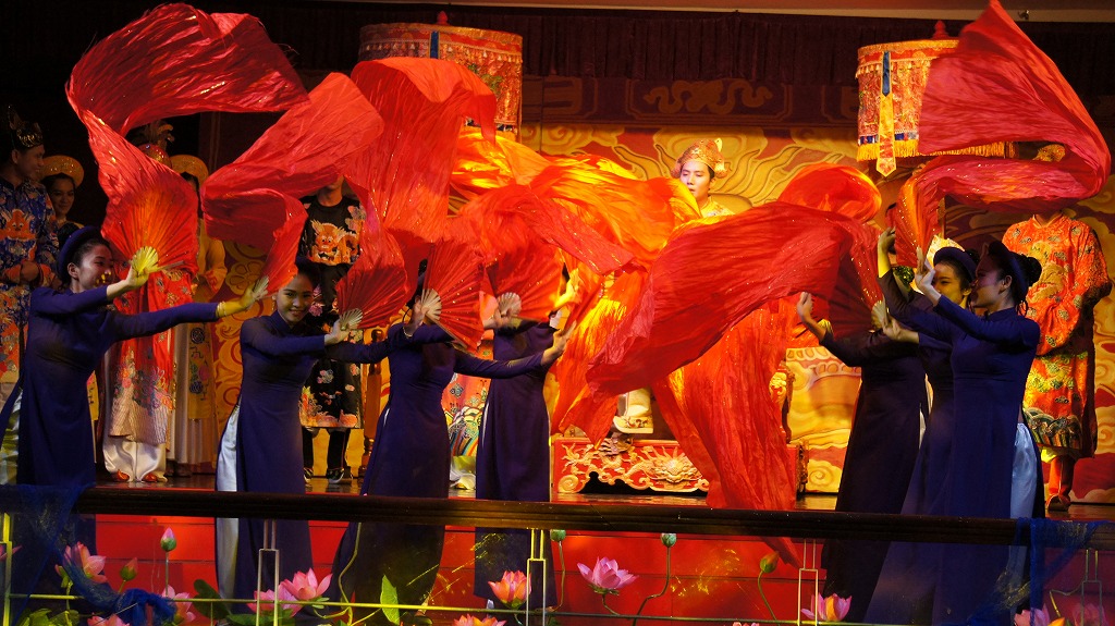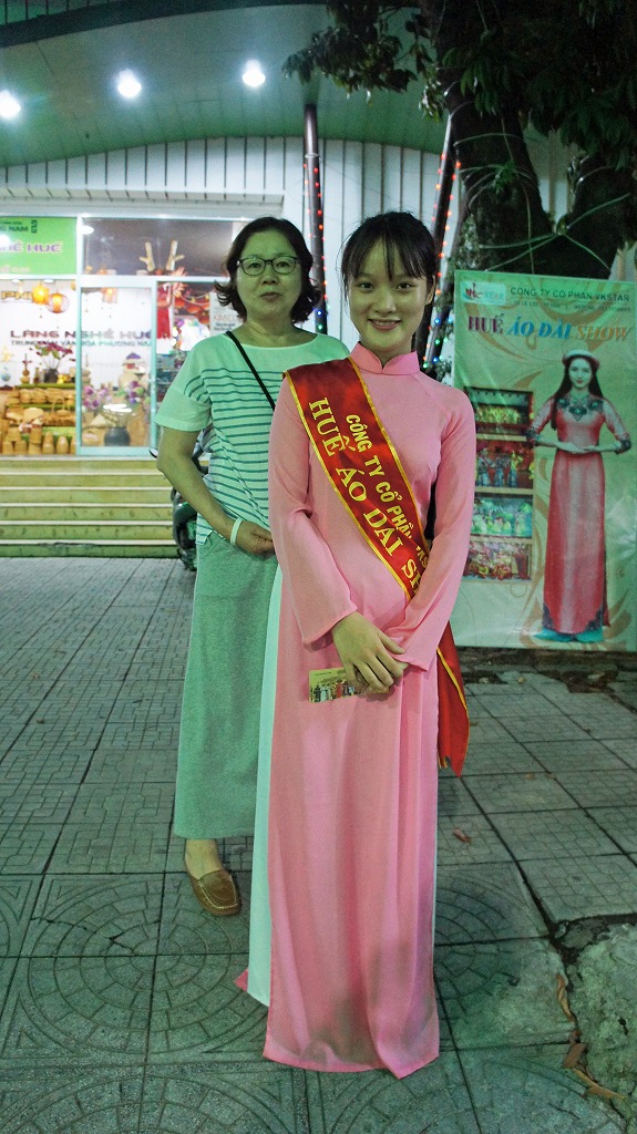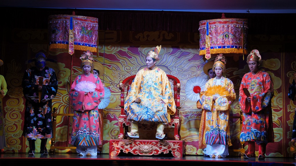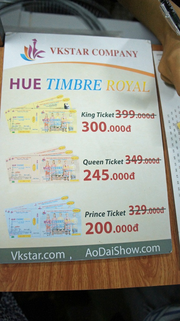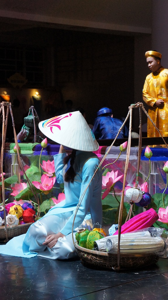 王宮の伝統芸能を観ることが出来なかったので、町中でパンフレットをもらったこのショーを観ることにしました。週に4日、火曜と木曜と土曜と日曜の開催なので注意が必要です。スタートは夜8時からで約1時間ですが、あっという間の面白さです。最後にアオザイのファッションショーがありますが、その後はアオザイのオーダー注文もできるようです。その辺りは観光客には関係ないかもしれませんが、宮廷の風景や高校生の白いアオザイ、昔の町を行く人々や物売りの風景、獅子舞も素晴らしかったです。フエで夜の時間をどうしようかと思ったらここはおすすめです。席は3種類ありますが、一番高い席でも1,500円ほどです。この席だとテーブルがあって、水とお菓子、劇中のお酒が飲めたり、ミニチュアのノン・ラーがもらえたり舞台と一体感が感じられて良かったです。場所は新市街のメインロード、川沿いのレ・ロイ通りのブックカフェの2階です。チケットは旅行会社でも扱っているようですが、入り口のチケットブースで席を選んで買った方が良いでしょう。