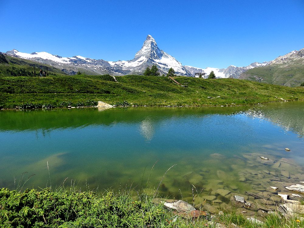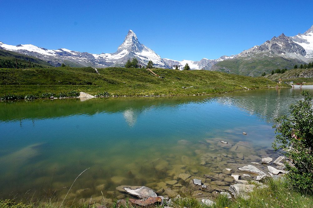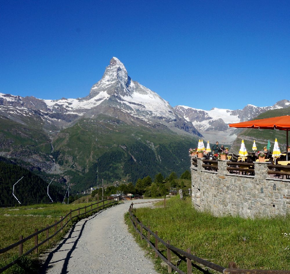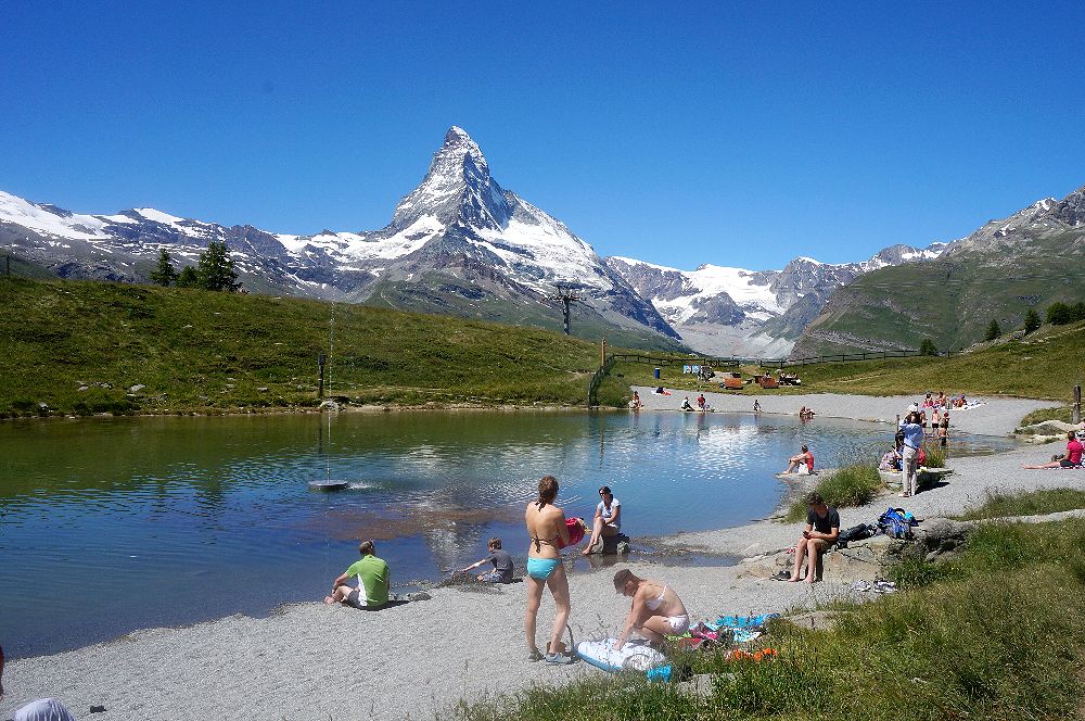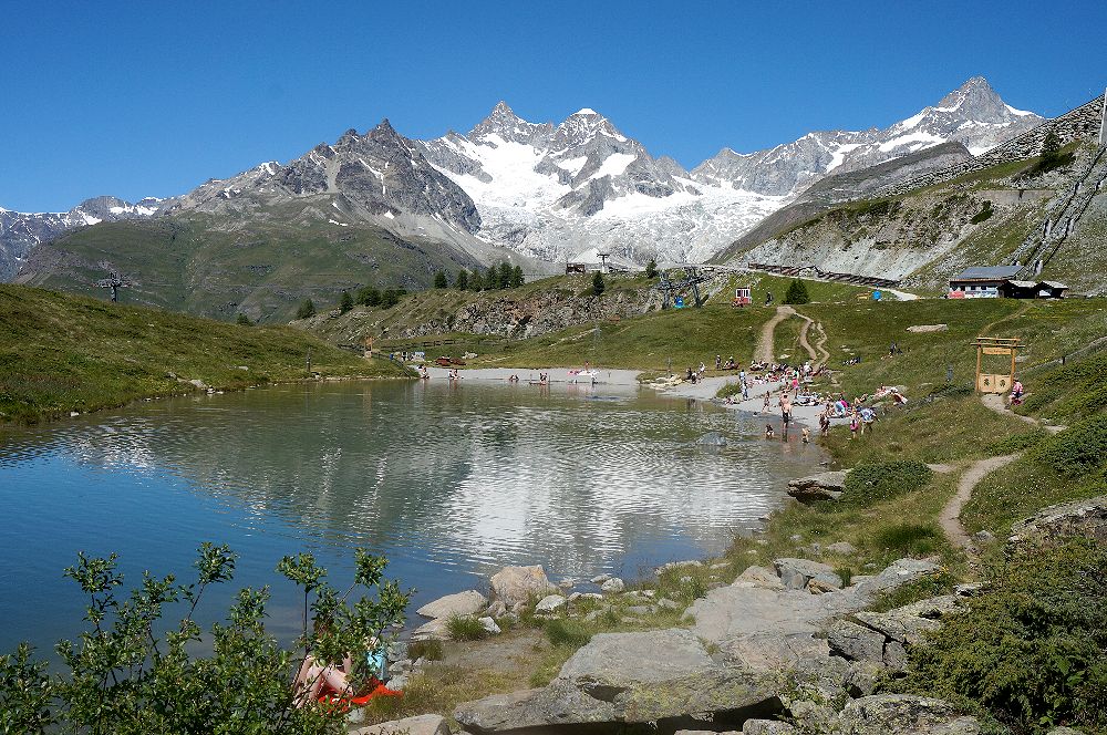 ツェルマットの駅からゴルナグラード登山鉄道の線路沿いの道を5分ほど歩き、さらに陸橋をくぐった先にあるケーブルカー駅から3分ほどでここに上がることができます。1989年と2012年に上った時には気づかなかったのですが、2016年にブラウヘルトからスネガまで歩いて下ってきたときに、スネガから近くのライゼーに行く短い無料のケーブルカーの存在を知りました。これを使うと、ライゼーからスネガの駅に戻るときに急坂を歩かずにすみます。ライゼーは赤ちゃんや子供づれの家族が湖水浴や近くの遊具で遊んだり、日よけのテントの中で涼んでいたりして、マッターホルンも望める絶好の行楽地になっていました。小さな子供を連れた観光客にはお勧めです。スネガからテレキャビンでブラウヘルトに行き、そこから逆さマッターホルンが美しいシュテリゼーまでは、ほぼ平坦な道を歩く楽なハイキングでお勧めです。健脚の人はシュテリゼーからスネガの駅までのトレッキングをするといいでしょう。この道は、マッターホルンの眺めもすばらしく、いろいろな花が咲いていて、運がよければエーデルワイズにも出会えるかもしれません。