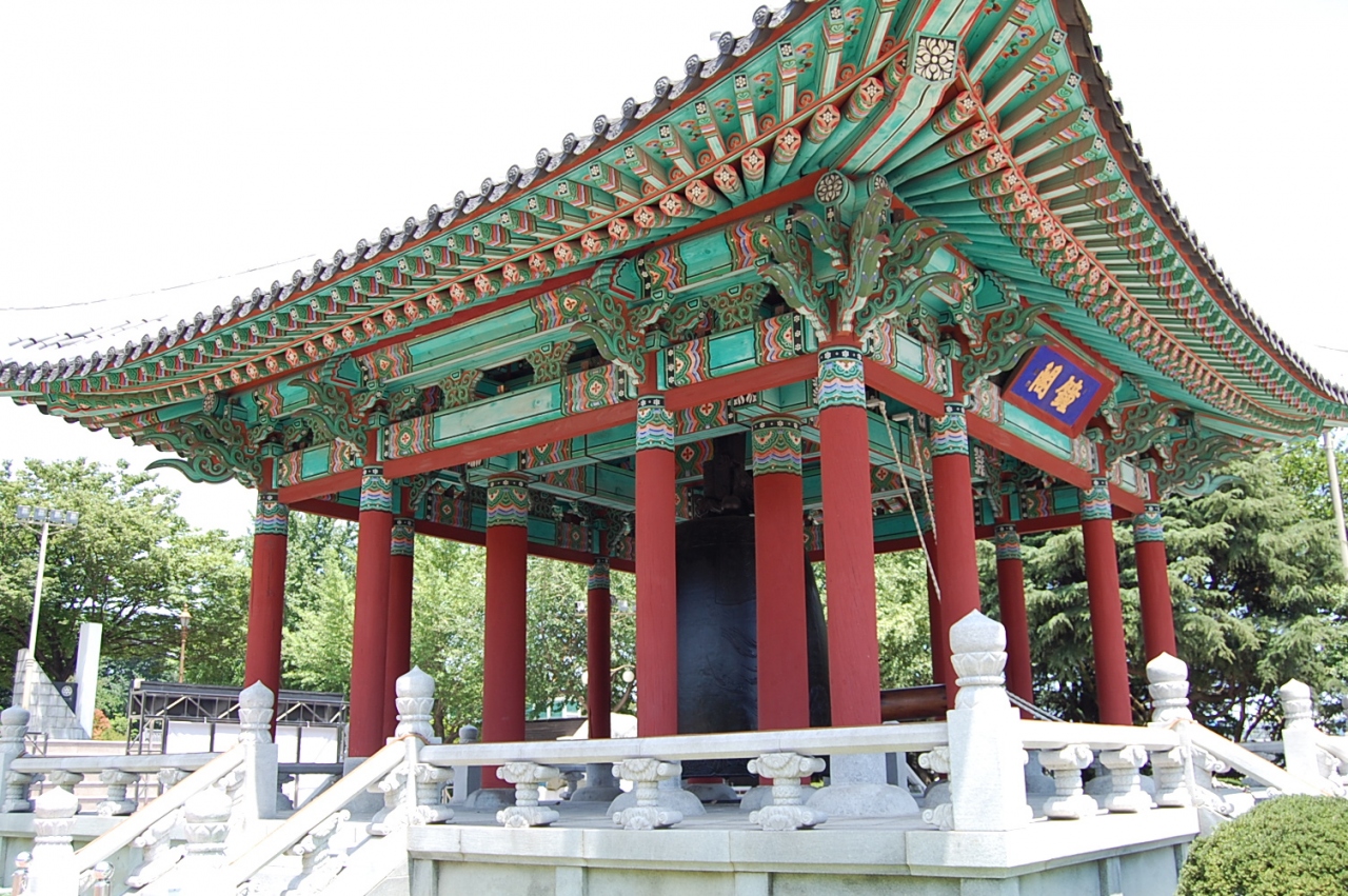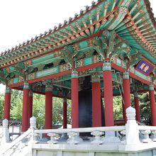 赤い柱が印象的な韓国式の壁のない建物の下に、この大きな鐘が備え付けられていました。
