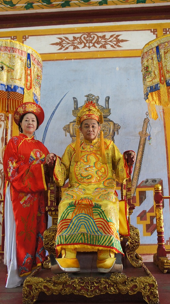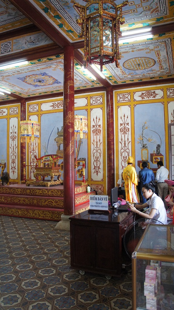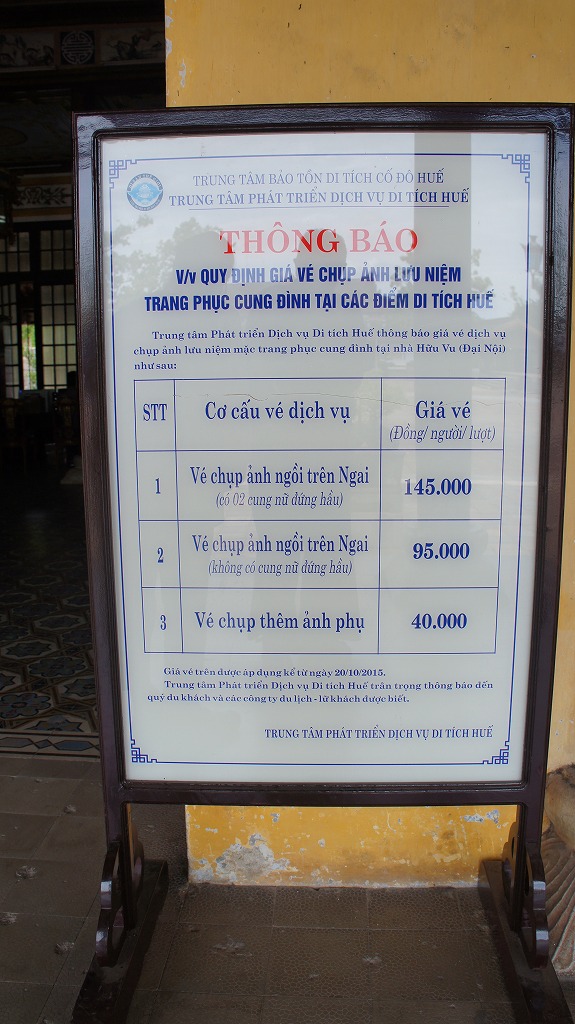 変身写真が面白いので参加しました。料金には3種類あり、95,000VND(450円ちょっと)の2番目のランクで充分だと思います。貸衣装とカメラマンによる撮影と自分のカメラでの撮影、(これもカメラマンが何枚も撮ってくれます。)2Lサイズの写真1枚プリントしてくれます。貸衣装は上にはおるだけですが、暑いのには参ります。全部で30分くらいかかるのでツアーで見学した場合は時間的に難しいでしょう。一人の場合は145,000VND(750円)で女官さんを2人侍らしてみるのも一興でしょう。