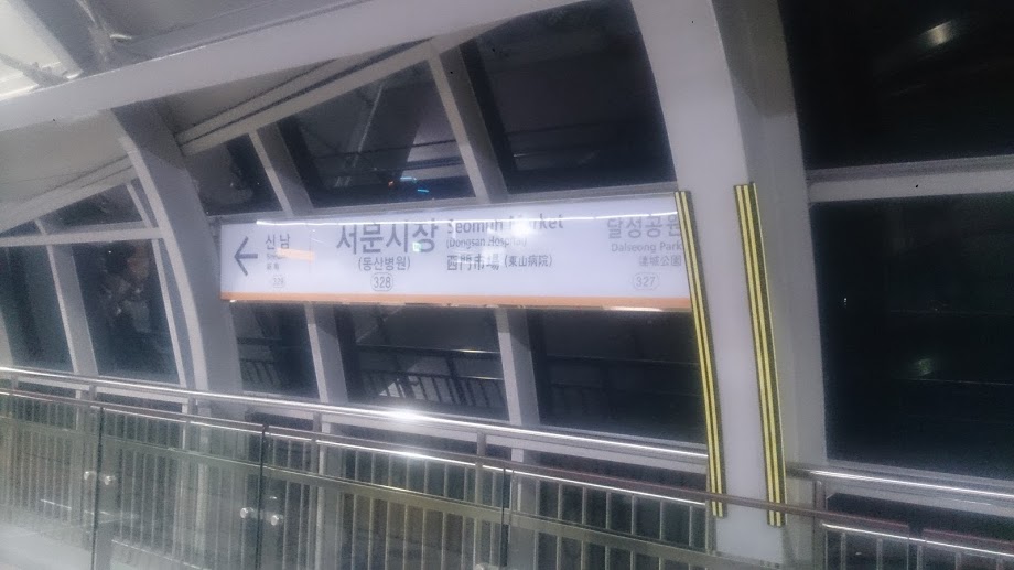 大邱都市鉄道の3号線(モノレール)の駅で、モノレールなので当然がら高架駅です。改札口を出て地上に降りるとすぐに、大邱の超メジャースポットである西門市場があります。利用したのは平日の夜9時頃でしたが、西門市場に訪れてる人でかなり混雑していました。駅自体の構造は単純な相対式ホームで高架の下を走っている道路も幹線道路なので、迷うことなく利用できます。また、最新鋭のシステムで管理されている駅でホームドアが設置されているなど安全に利用できます。