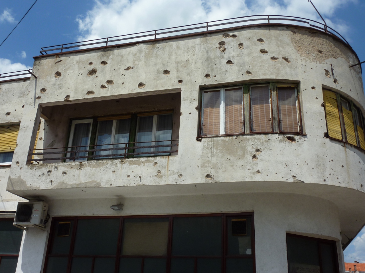 モスタルでスターリ・モストから土産物店を抜け、市街地方向に歩くと普通の街の雰囲気になってきます。でも交差点に立つ建物の壁にはいくつもの弾痕が残っています。1993年の内戦時、ここが戦場になり、町中で銃撃戦が行われ、周囲の建物に打ち込まれた痕が残されていて、平和を考えさせられる場所になっています