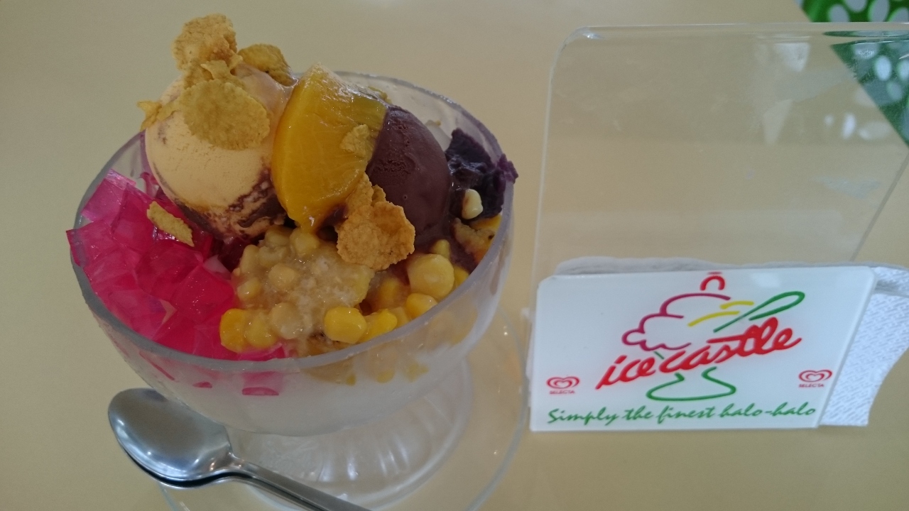 ハロハロは、氷の上にアイスクリーム(紫芋も少しありました)・寒天・プリン・コーン・ナタデココ・コーンフレーク・フルーツが載っていました。