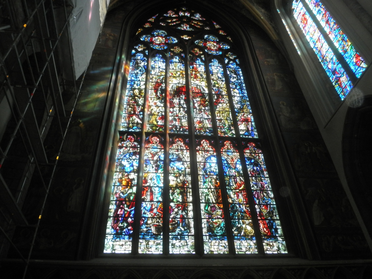 高い天井と鮮やかな色使いのステンドグラスが印象的でした。柱に飾られた多くの彫刻も見ごたえがありました。