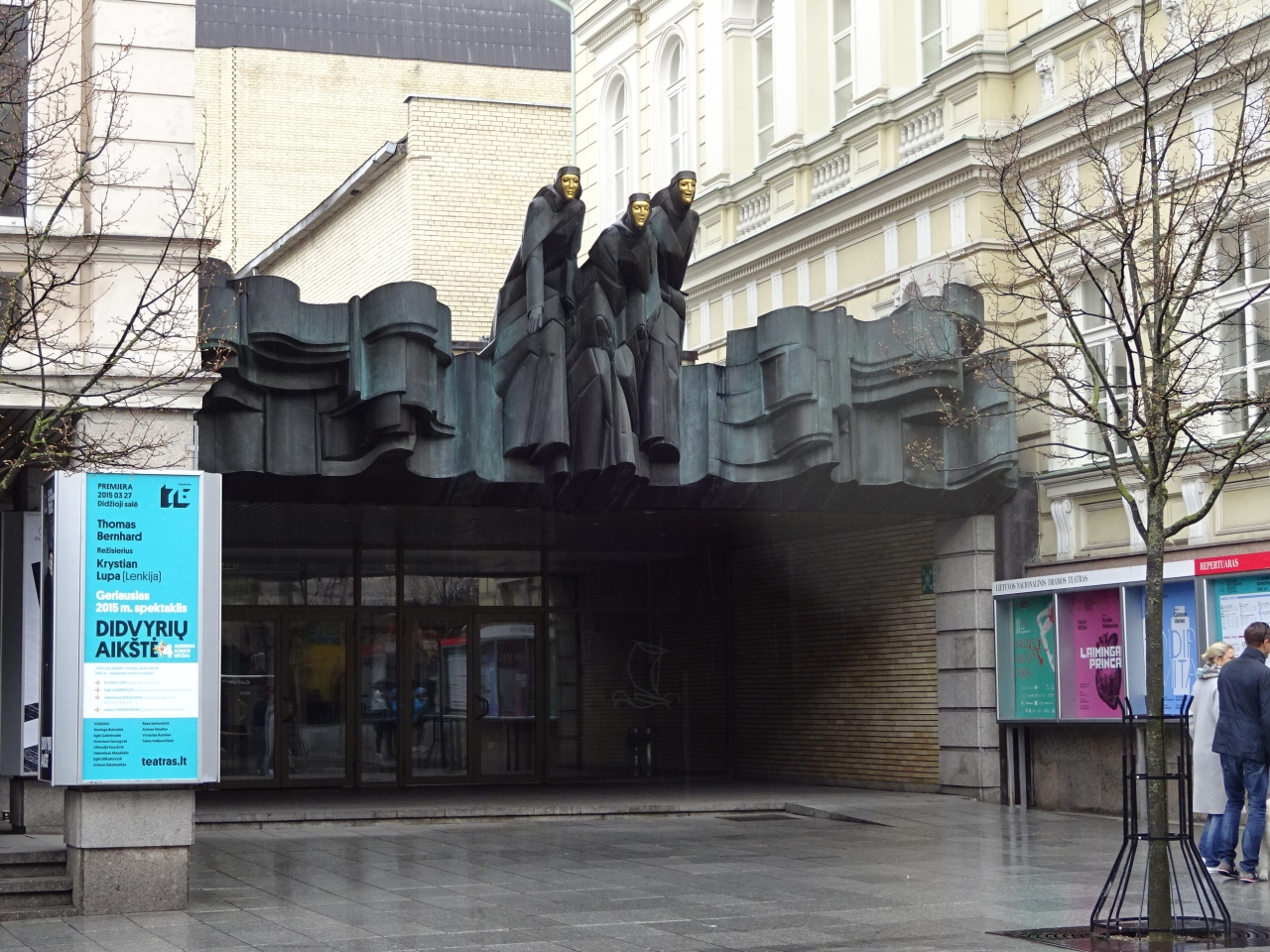 ゲディミノ大通りを歩いていて発見しました。なんじゃこの像!写真で見たことある、国立ドラマ劇場だ。
