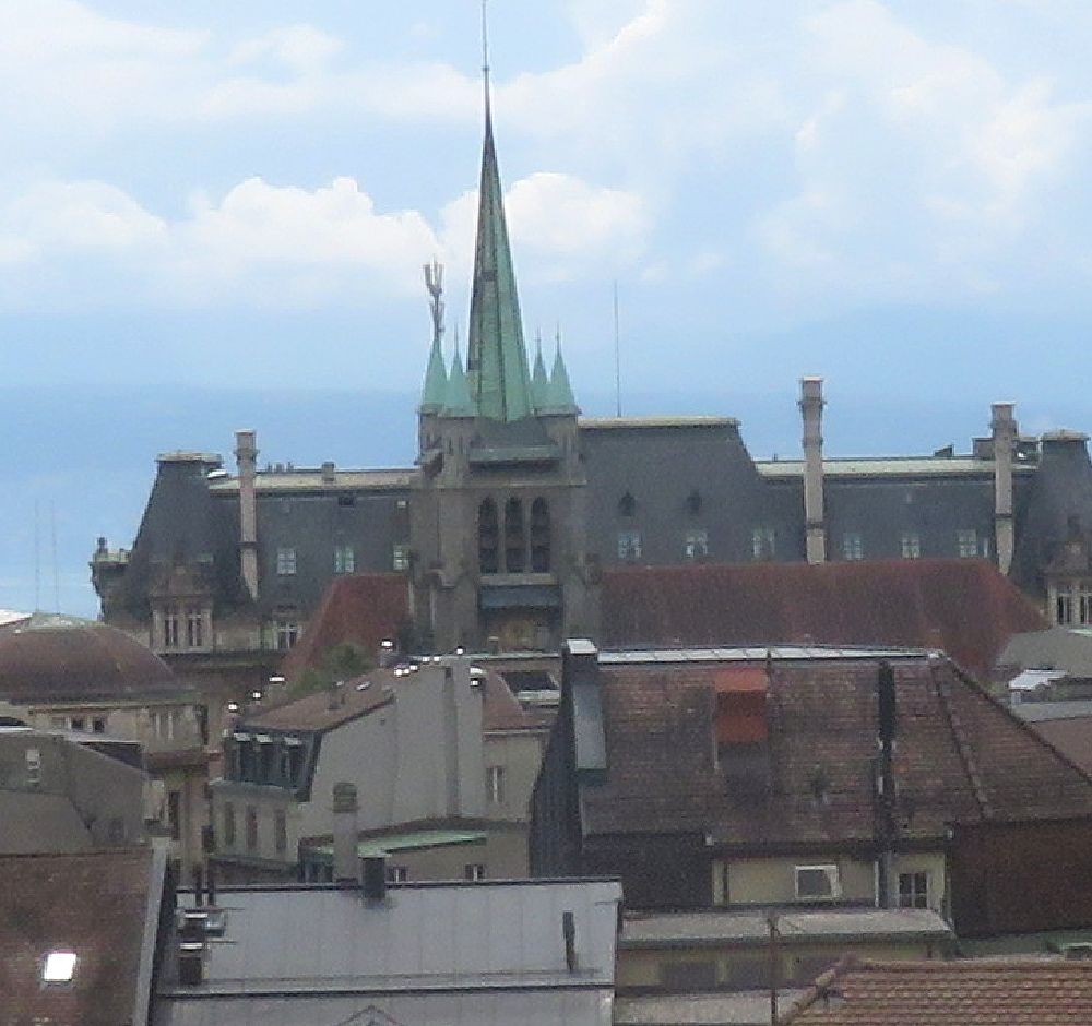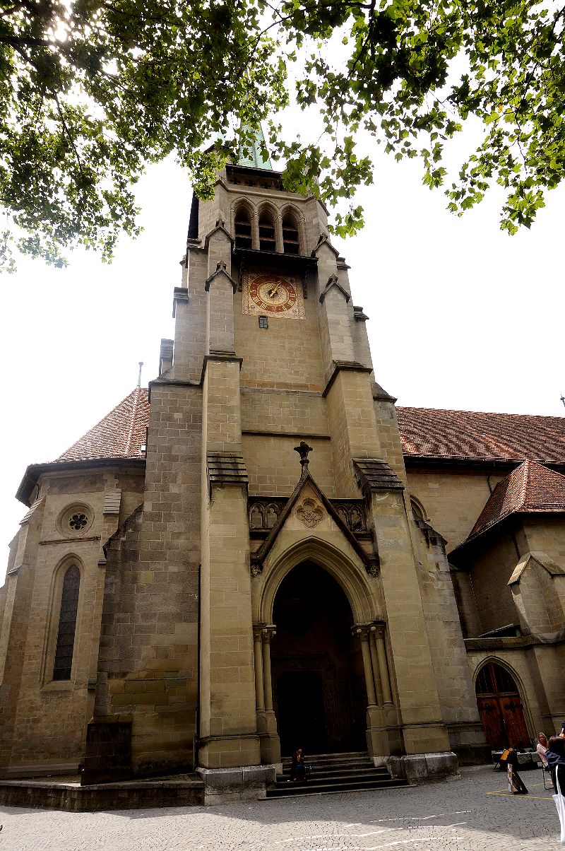 ローザンヌ国鉄駅からはやや離れていますが、地下鉄のフロン駅から歩いてすぐ、旧市街の入り口近くに堂々と建っています。私達はレンタカーで市内を通過する途中で、ノートルダム大聖堂を見学するため、大聖堂に向かって歩いている途中、この教会のそばを通りました。緑色の屋根が目印です。1272年に建設され、中世ではフランシス派の修道院だったのが、16世紀の宗教改革後にプロテスタントの教区教会になったそうです。旧市街に近いので、教会の周囲は多くの観光客で賑わっていました。ノートルダム大聖堂の庭のテラスからもその緑色の尖塔部分がひときわ目立っていました。大聖堂とともに、ローザンヌのシンボル的存在です。