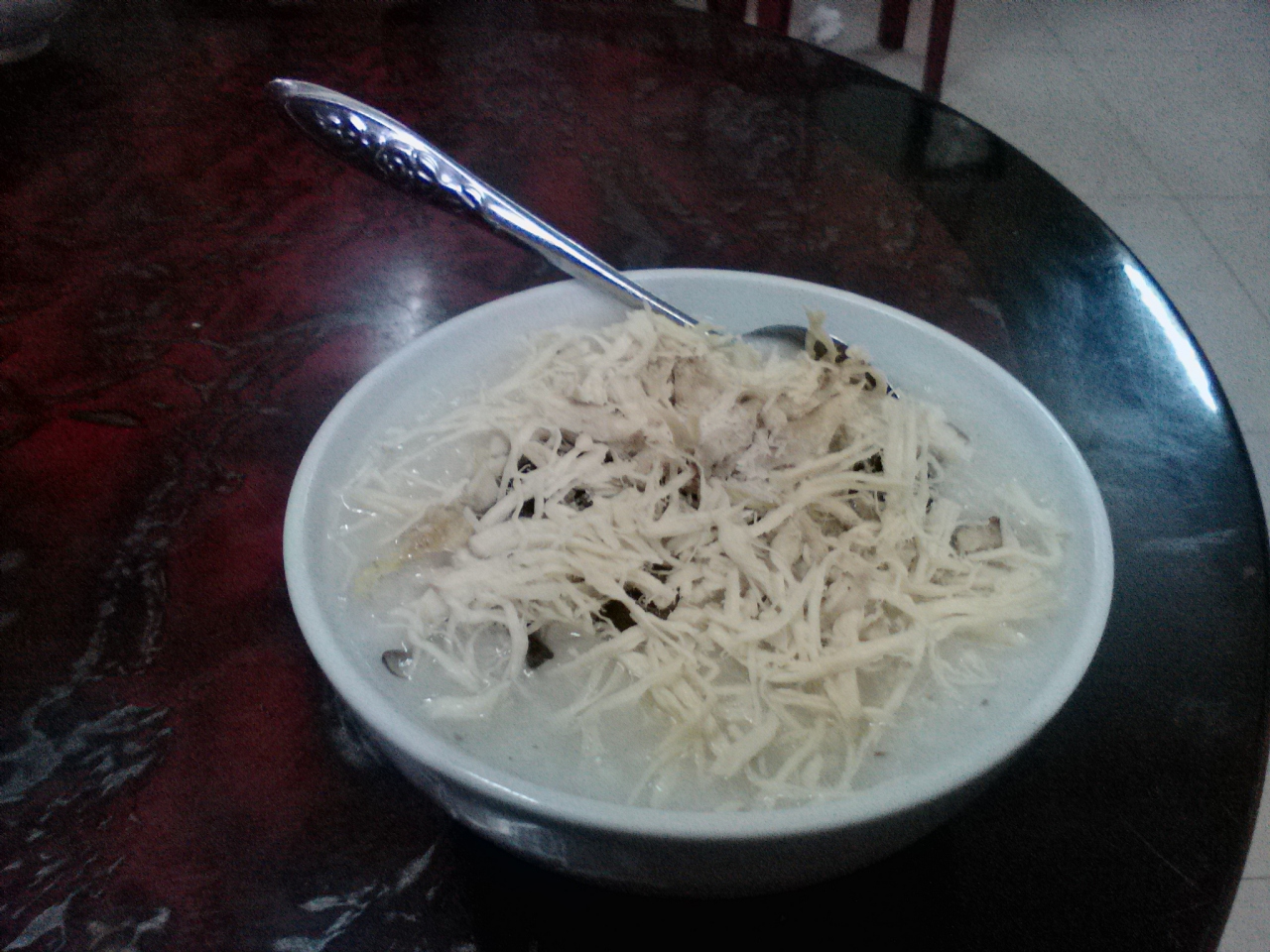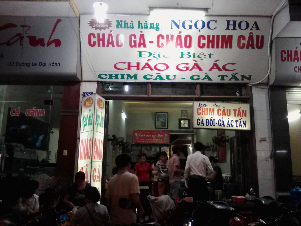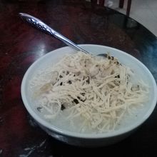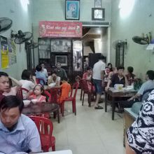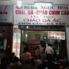 Le Dai Hanh通り、バスターミナルの50m北側には10軒ほどのお粥屋が集まっています。でその中で一番繁盛しているのがこの「ゴックホア」。客が1人もいない店がある中でここは毎晩混んでいてとても対照的。その理由を確かめに行きました。メニューはいくつかありますがよくわからないので基本のチャオガー(鶏肉のお粥)2万ドンをオーダー。卵を入れると2万5000になります。お粥はすでに作ってあるのですが客の多い時に行くと少し待たされます。具はほぐした鶏肉の他にねぎ、きくらげ、しそ。きくらげの食感としそがいいアクセントになっていてなかなかおいしいです。薄味なので塩や胡椒、ヌックマムなどをお好みで加えるとさらに美味しくなると思います。客のいない店で食べてハズレるのが嫌なので他の店と比べることはできませんが確かにこの店はおいしいです。
