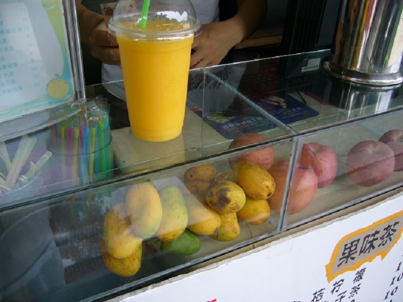 桂林を南北に流れる漓江(りこう)、観光のハイライトと言えば「漓江くだり(漓江游)」です。出港は「竹江码头(竹江桟橋)」から約4時間ほどで終着地の陽朔(ようこう)に到着です。陽朔の桟橋で記念写真を撮り、そして土産物店が並んでいる西街があります。ここから環境に優しい電動カーでの移動となります。厳しい暑さの中、喉も渇いていたので搾りたての美味しいマンゴジュースをいただきました。100%果実たっぷりのジュースなので濃厚で甘みもバッチリです。中国で珍しいほど美味しいジュースに出会い感動しました。街中を散策しましょう。