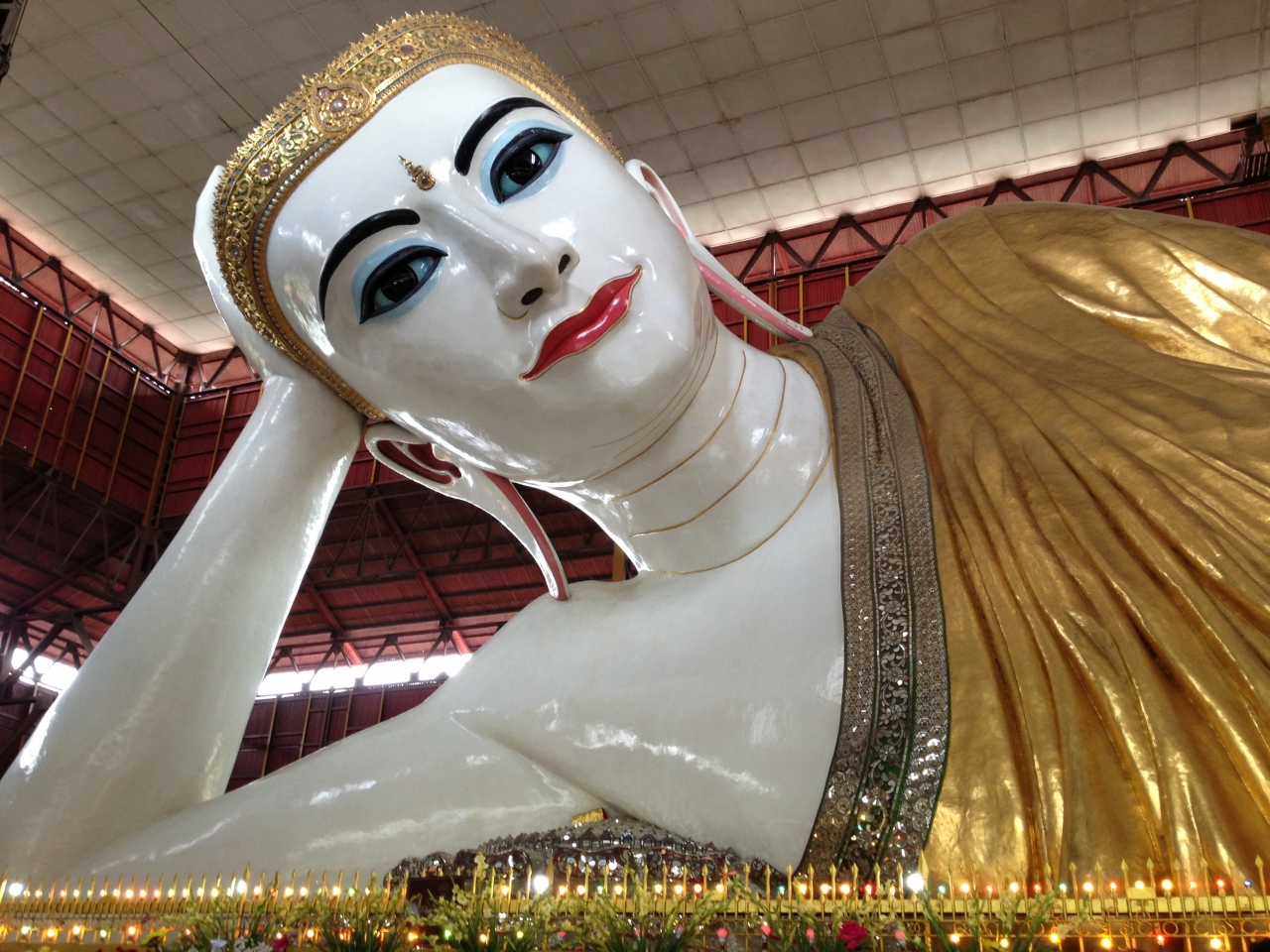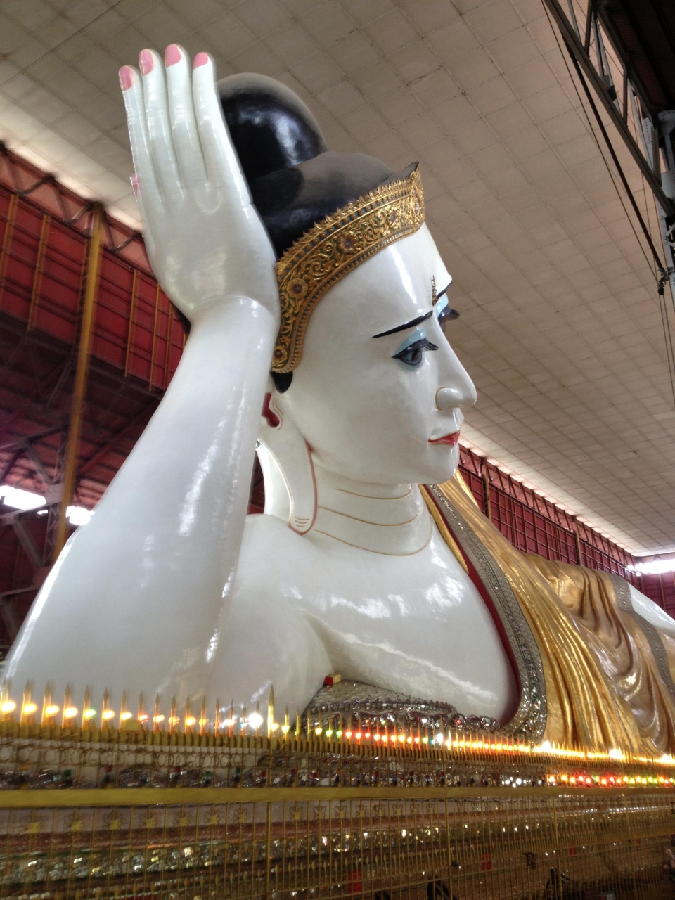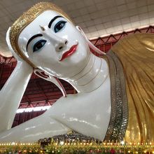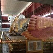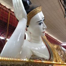 目鼻立ちががくっきりとしてスリムな体形の涅槃仏で、イケメンのお釈迦様に会えるとも形容できる寺院です。金と白のコントラストも美しく、頭から足の裏まで観させていただきました。顔の表情が角度によって変わるのが不思議でした。