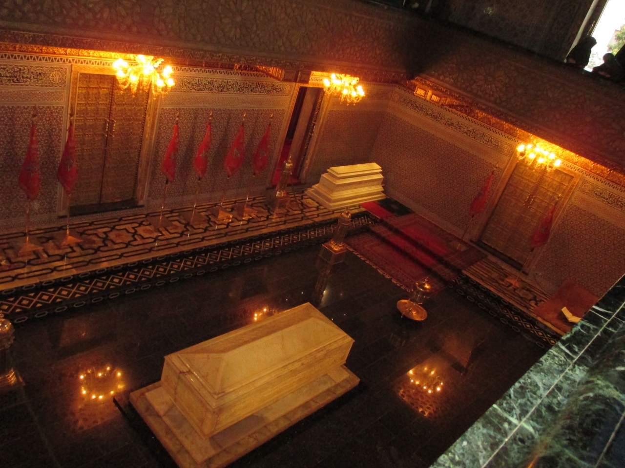 フランスからモロッコの独立を勝ち取った元国王ムハンマド5世の霊ちょうです。内部は天井のステンドグラスが真っ白な石の棺に反射して華やかです。1Fから見るよりも2Fから見る方が綺麗に見えます。外部の幾何学模様も素敵です。